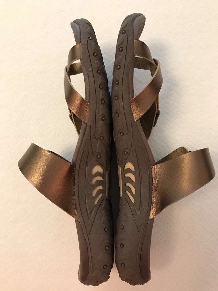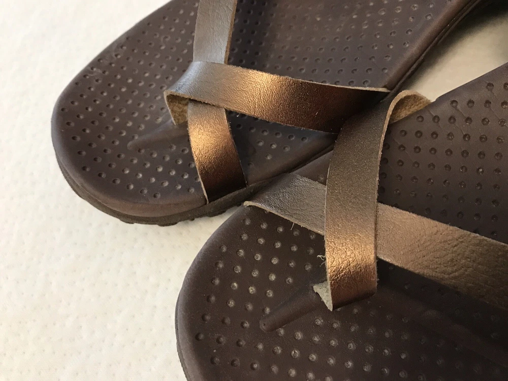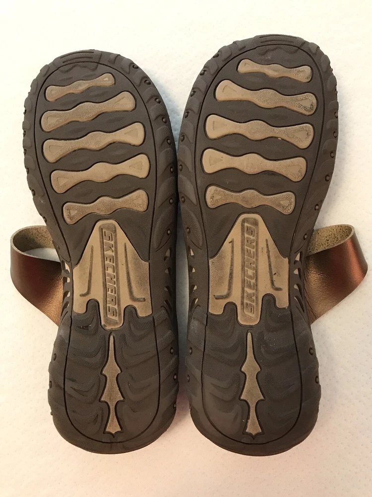 **** Very small dark mark on one strap. Please see the last photos for the example. ***** Step into effortless style and comfort with these Skechers Outdoor Lifestyle sandals, perfect for women who appreciate a blend of practicality and elegance. The bronze brown hue offers a versatile look that easily transitions from a casual day out to a relaxed evening event. With a supportive rubber outsole and a soft synthetic upper, these sandals are designed to provide comfort for all-day wear. The Skechers 40981 model features a solid pattern that exudes a preppy, outdoor vibe, making it an ideal choice for various occasions, from travel to activewear. The slide-on style ensures ease of wear, while the standard shoe width accommodates a snug and comfortable fit. Whether you're enjoying the fall foliage or strolling through the city park, these flat-heeled sandals are a dependable go-to for your footwear collection. In a smoke free home.