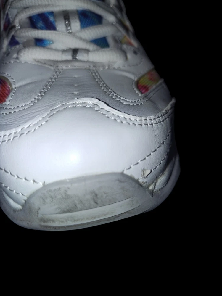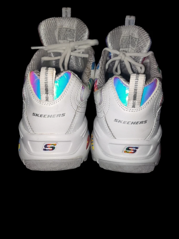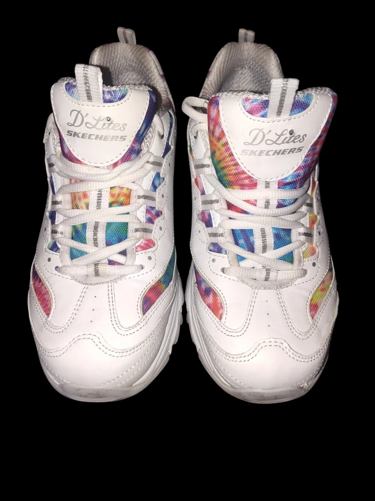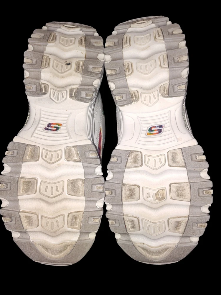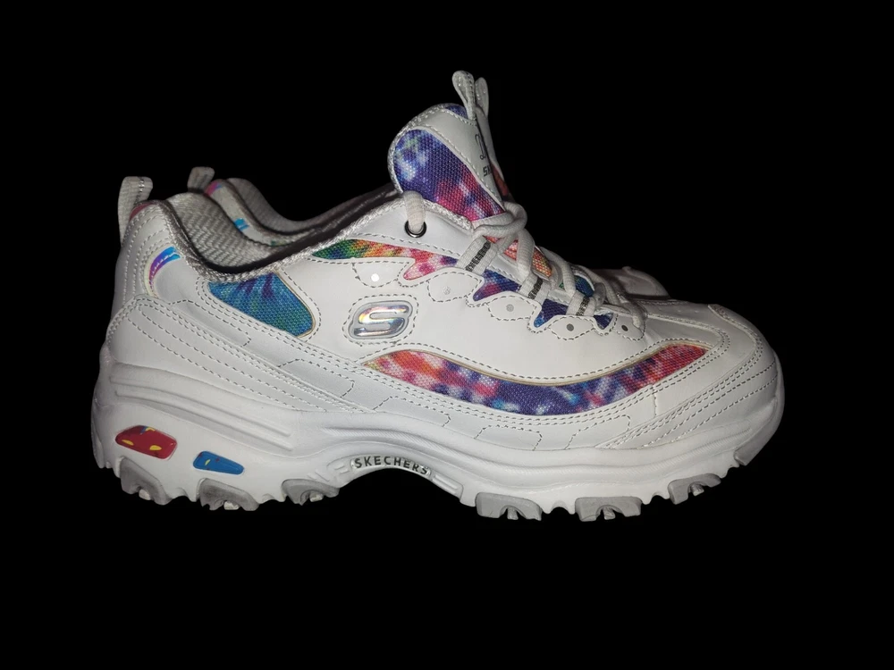 Elevate your athletic style with these Skechers Women's D'Lites Leather Lace Up Shoes in Dreamy Sky White. These fashion sneakers feature a low top shoe shaft style and lace-up closure for a secure fit. The upper material is made of premium quality leather and the insole is made of foam, providing comfort and support for walking, cross training, CrossFit, running, and jogging. These shoes have a stylish look with accents of the Skechers logo and a white and multi-color scheme. They are perfect for any season, whether it's winter, summer, fall, or spring. The shoes come in a US size 9.5 and UK size 6.5, with an EU size of 39.5. Get ready to step up your fitness game with these Skechers Memory Foam shoes.