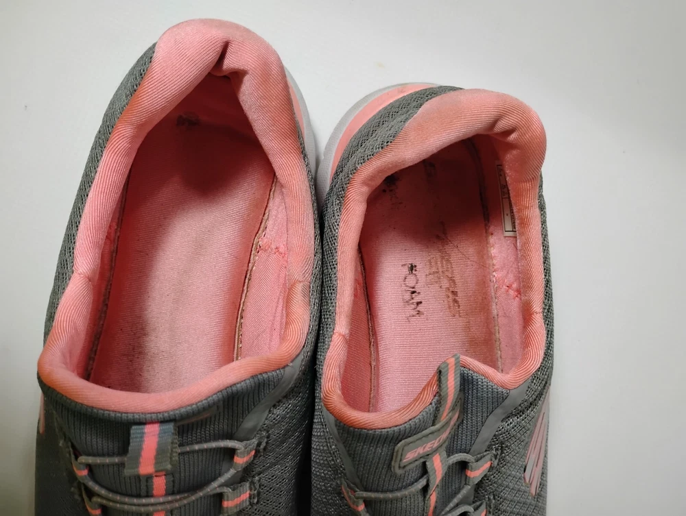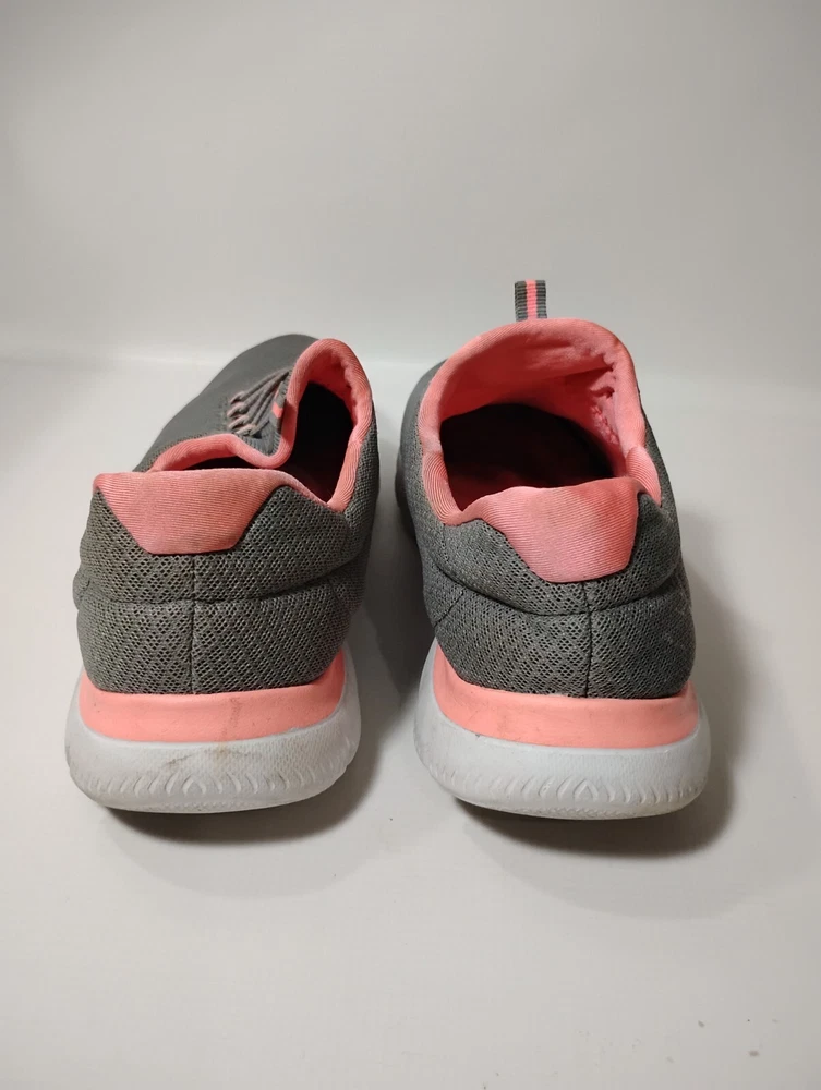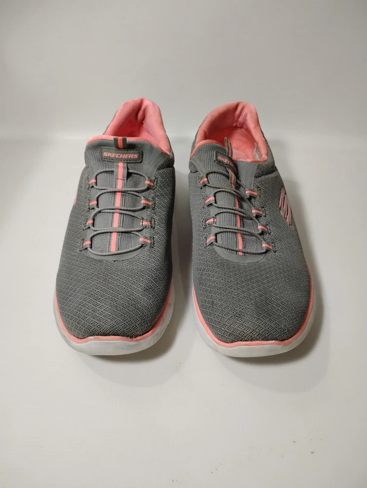 These shoes are in great condition with no rips or tears. One shoe has a small stain on the side. see pictures for details. Used with plenty of life left in them. This is a pair of Skechers Women's Summits running shoes in size 10. They are slip-on sneakers with a mesh fabric upper in gray and pink. The shoes feature a rubber outsole, breathable comfort, Skechers Memory Foam insole, and are suitable for all seasons. The style code is 12980W, and they are designed for casual wear and sports activities.