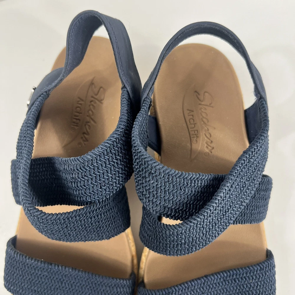 Skechers Women's Arch Fit Beverlee Love Stays Navy Wedge Sandals Size:6 195H Shipping is calculated by eBay based on weight and size of package, which sometimes seems high, even to the seller. Therefore, sellers shipping discount is shared with the buyer making it as low as possible. We use recycled shipping supplies, when possible. Due to new USPS policies, your item may take longer than USPS/eBay promises. Orders will be processed within stated time by seller. Security measures are taken to protect seller from fraudulent activity.