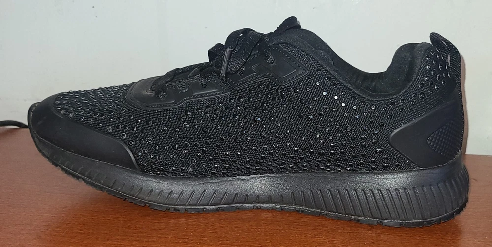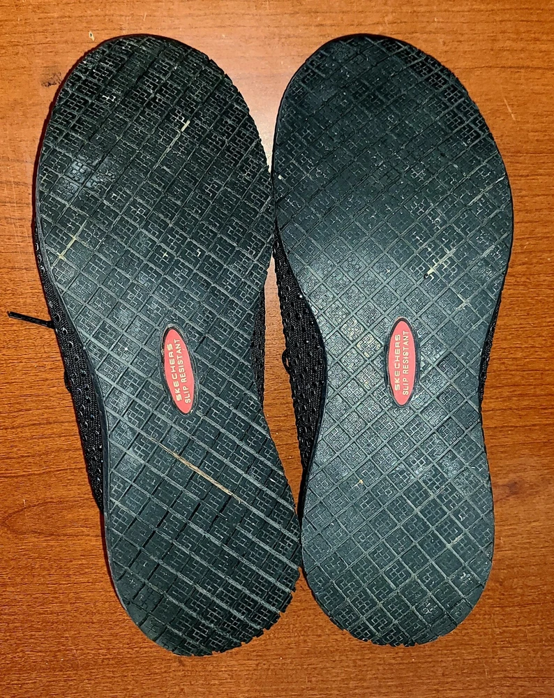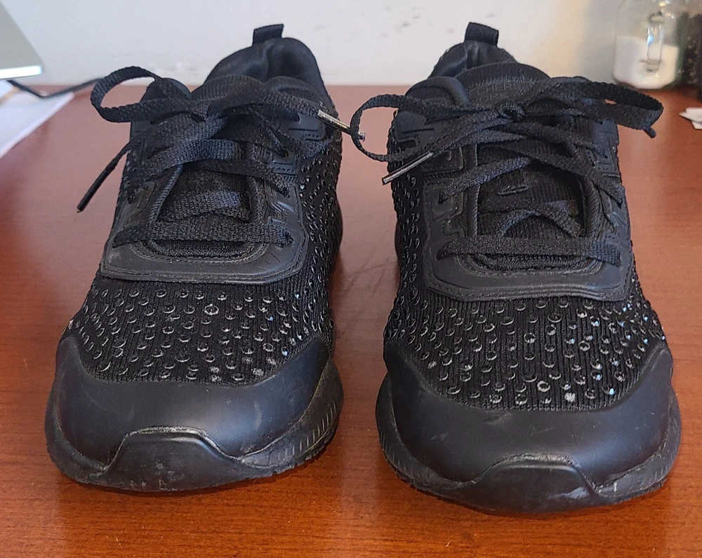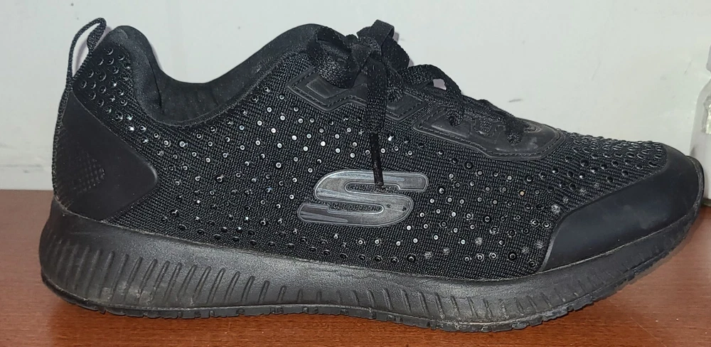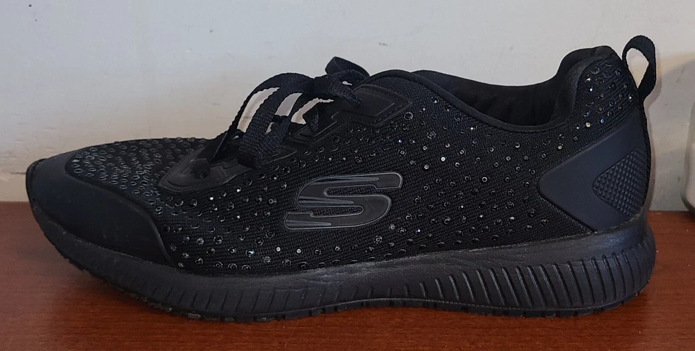 Elevate your work shoe game with these stylish and comfortable Skechers sneakers. Designed with slip-resistant features, these black lace-up sneakers are perfect for any casual occasion. The women's size 9.5 shoes are made with high-quality materials that ensure durability and longevity. The sneakers are crafted with a comfortable fit and a stylish design that complements any outfit. The brand's signature slip-resistant feature ensures that you stay safe and comfortable while wearing these sneakers. These shoes are perfect for any woman who wants to add a touch of elegance and comfort to her shoe collection.