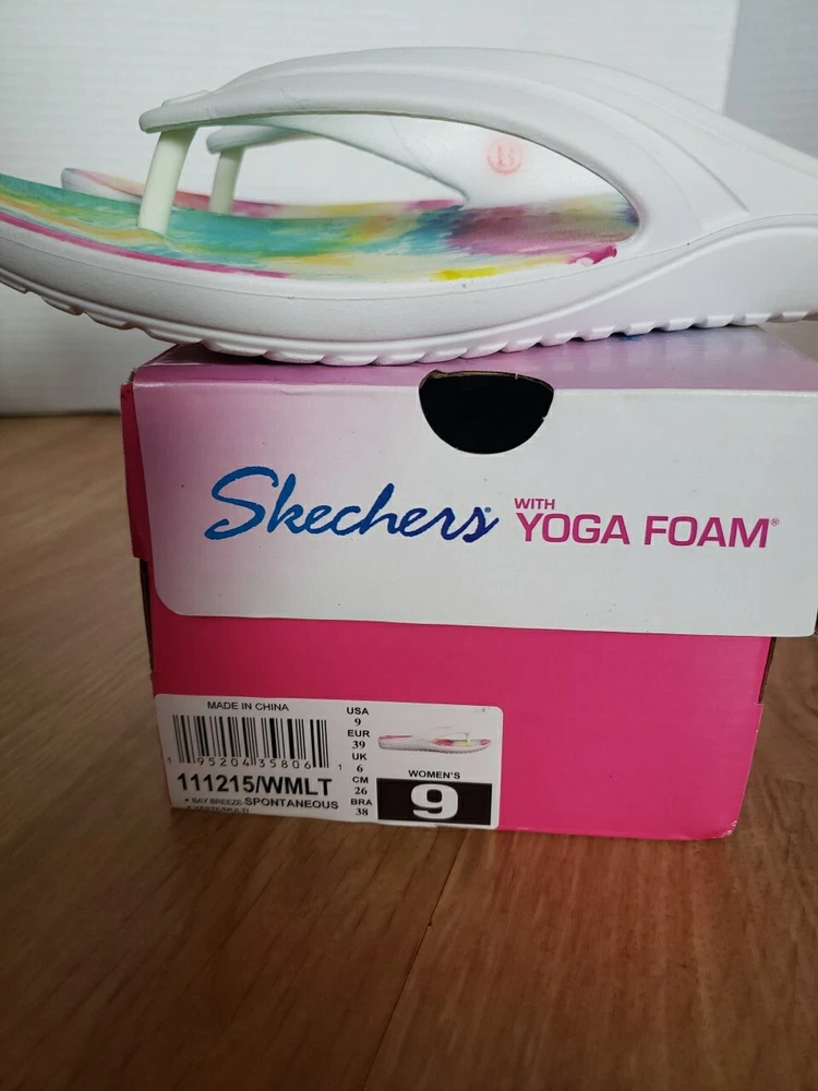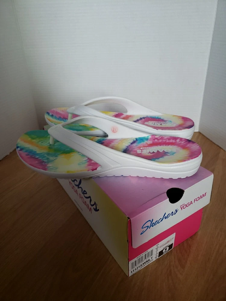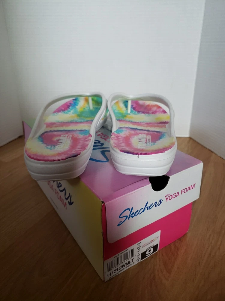 Skechers with Yoga Foam sandals Size 9 White with rainbow tie dye inner soles New in box See photos for details Thanks for looking!