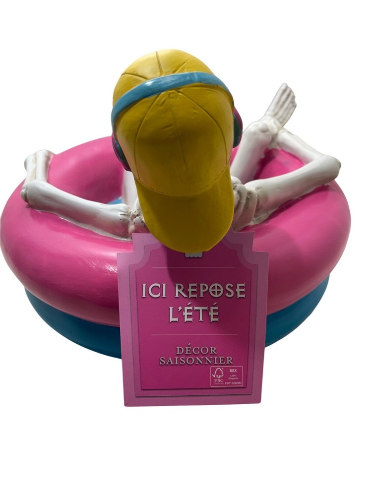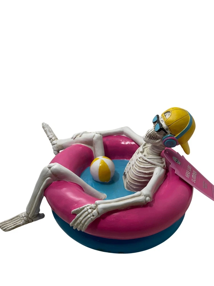 This decorative skeleton figure adds a whimsical touch to seasonal decor. Crafted with vibrant colors, it's designed to bring a unique flair to spaces. • Made of durable resin material • Features a detailed skeleton in a vibrant pool • Includes a beach ball and accessory details • Lightweight and easy to display Height = 12 inches, Width = 10 inches