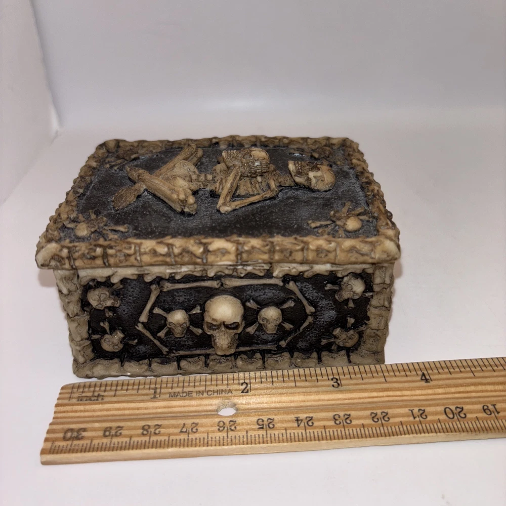 This is a resin trinket box decorated with a skeleton and skulls. Nice Halloween decor.
