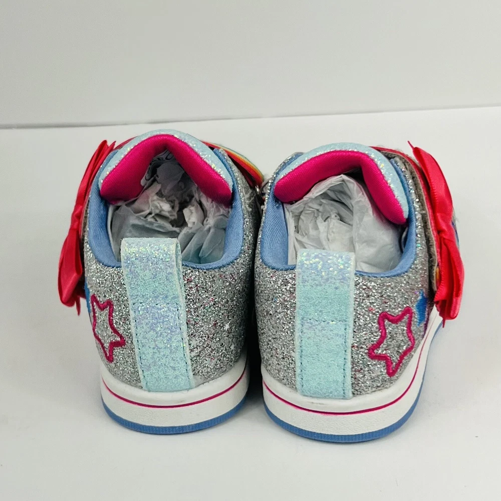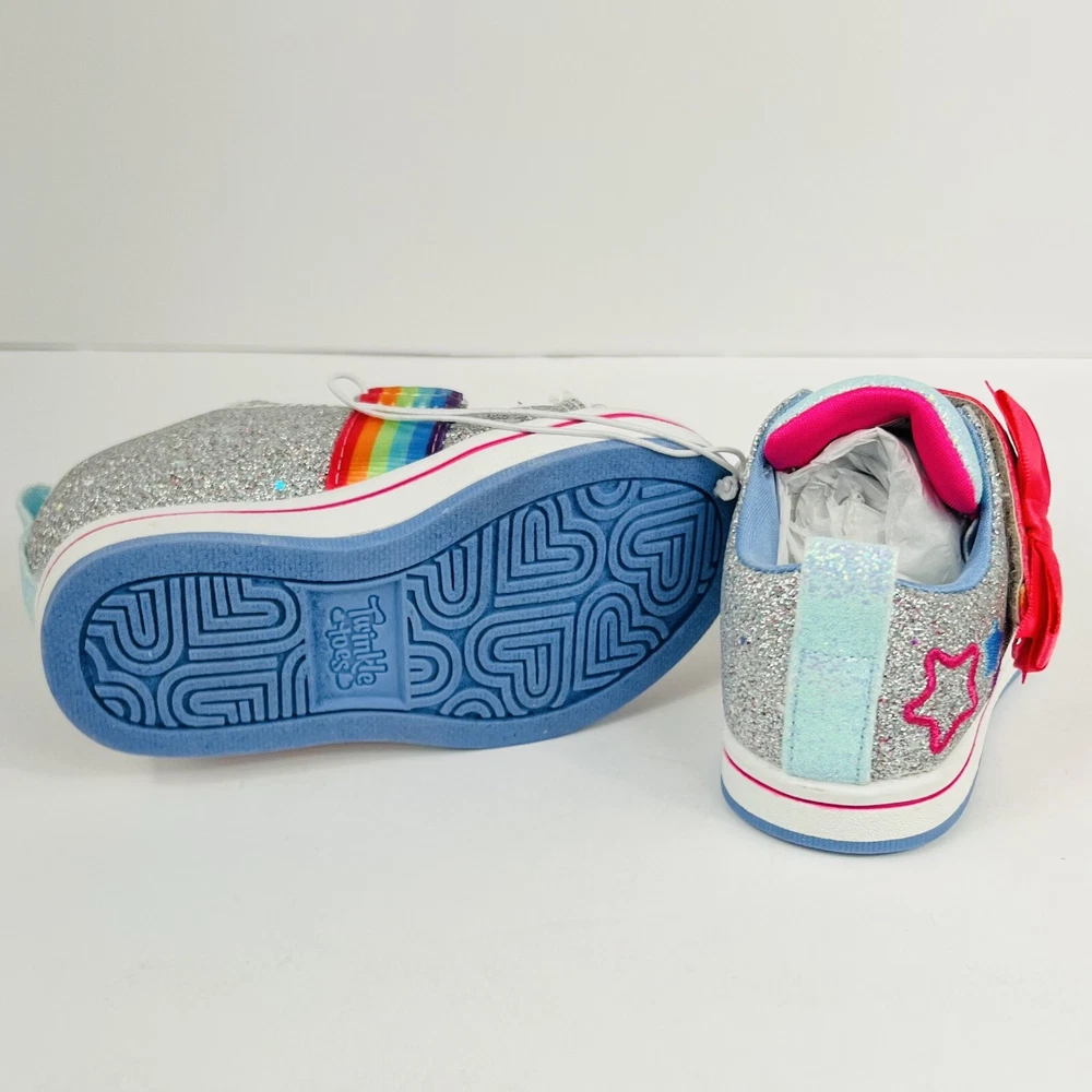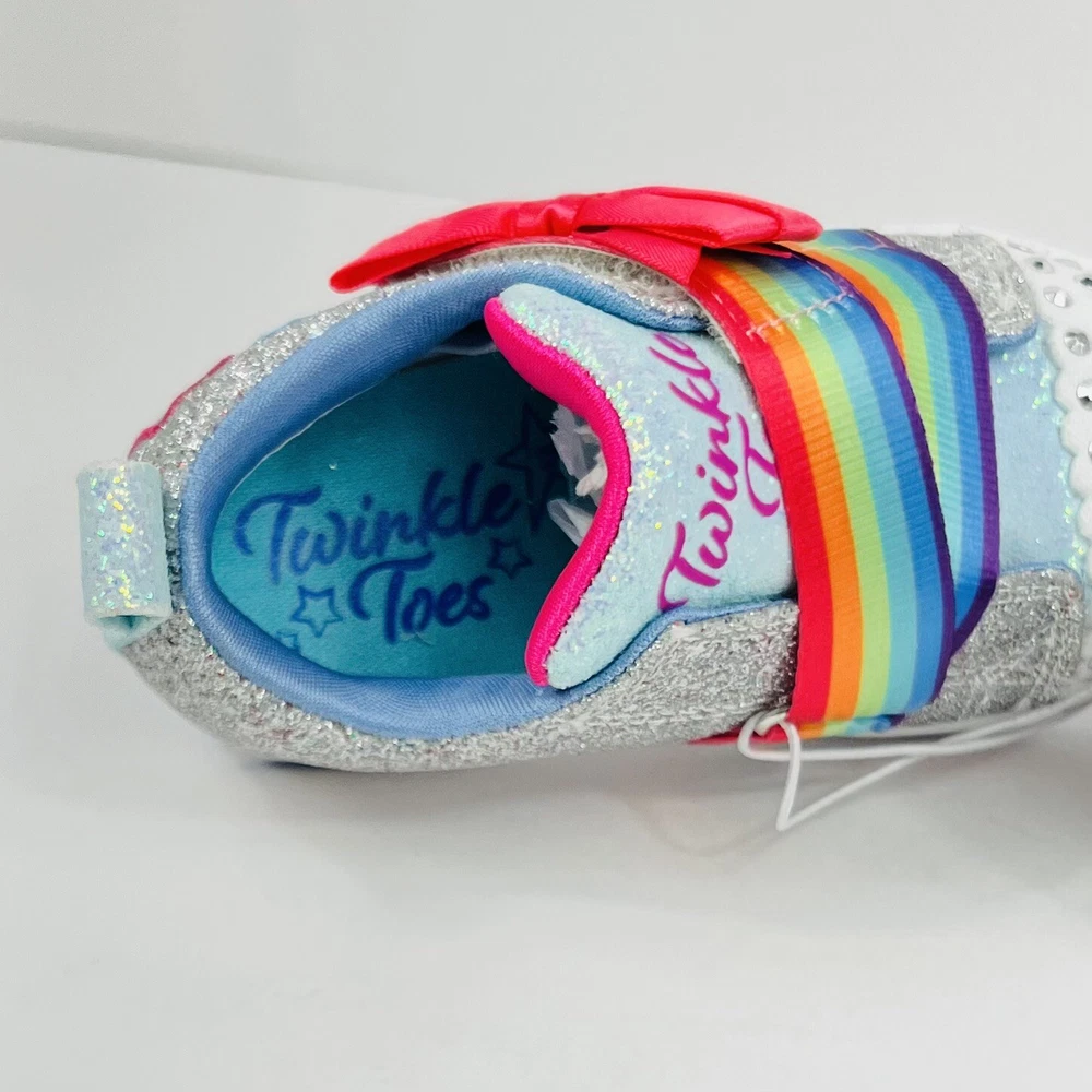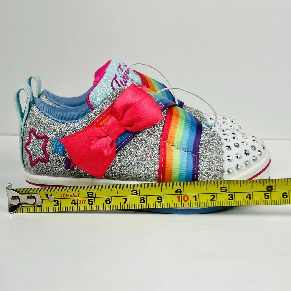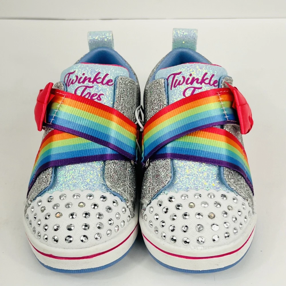 Super cute, sketcher, twinkle, toe girl, shoes size 6. Adorned with silver sparkles, stars above and velcro rainbow strap. Rhinestones on the toe light up with each step. New without box. Measurements: 6 1/8” length Shipping is calculated by eBay based on weight and size of package, which sometimes seems high, even to the seller. Therefore, seller shipping discount is shared with the buyer making it as low as possible. We use recycled shipping supplies, when possible. Due to new USPS policies, your item may take longer than USPS/eBay promises. Orders will be processed within stated time by seller. Security measures are taken to protect seller from fraudulent activity.