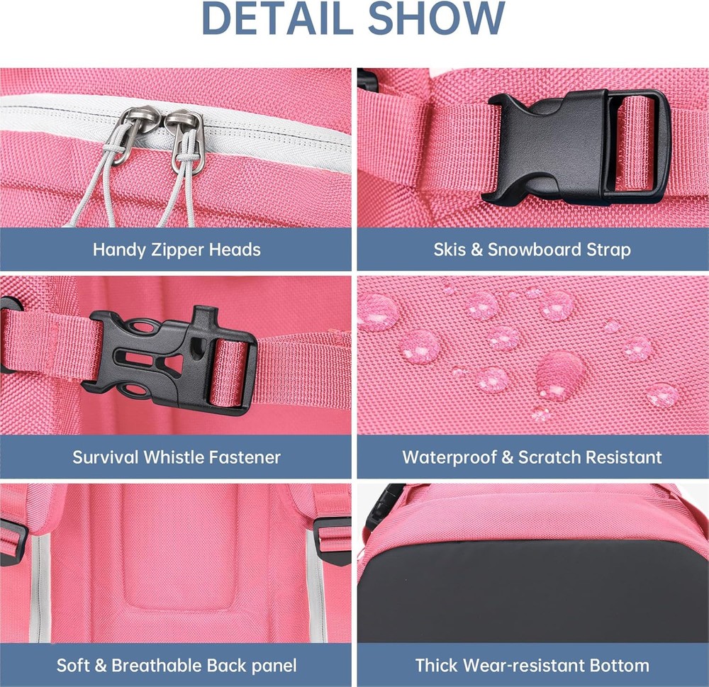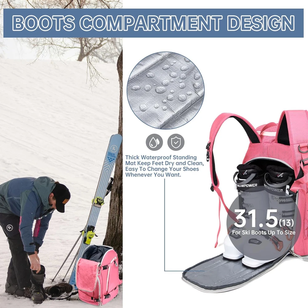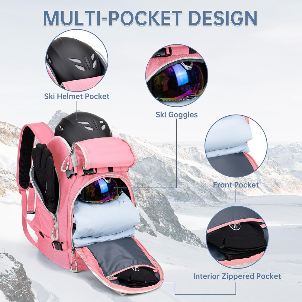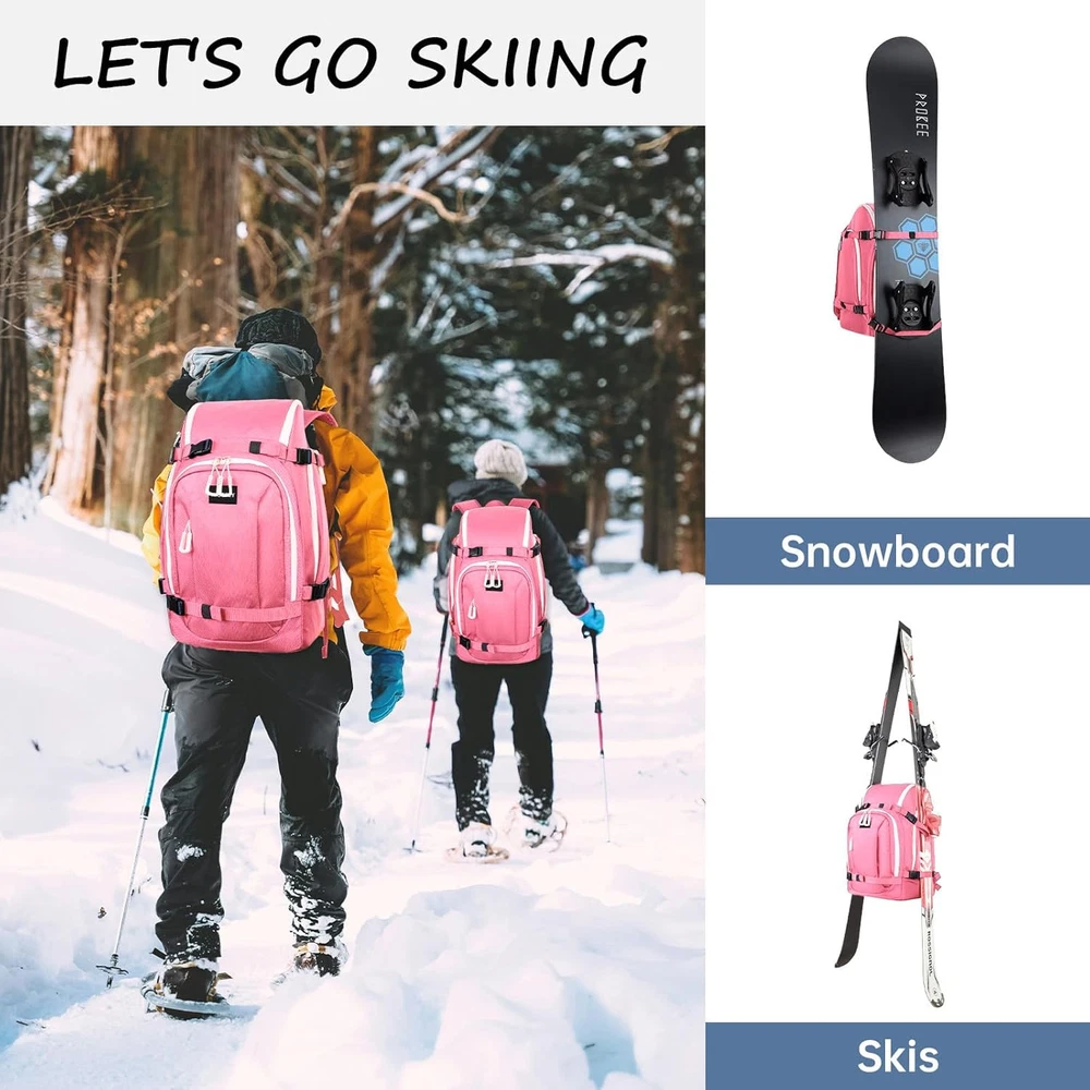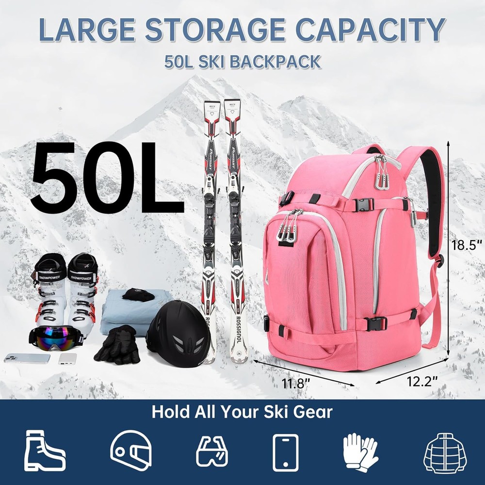 Ski Boot Bag, 50L Travel Backpack for Skis, Snowboard One Size, Pink Product Details Brand: MIGGEEY Closure Type: Zipper Strap Type: Adjustable Pocket Description: 3 separate pockets Pattern: Solid Capacity: 5E+1 Liters Handle Type: Strap Shell Type: Soft Package Dimensions: 13 x 13 x 3 inches Item Weight: 2.79 pounds Department: Unisex Adult Manufacturer: MIGGEEY Item model number: 50SKI-06 Size: One Size Color: Pink Material: Nylon Sport: Skiing Style: Sport ❄️50L Storage Capacity: Roomy enough to pack all your skiing gear in one skiing bag. Can store your ski suit, helmet, goggles, gloves & other accessories and keep them orderly. If you need a skiing boot bag, this one will definitely satisfy you. ❄️Easy To Reach: Individual compartment allows you to pack your skiing essentials orderly. Quickly access your gears by using handy zippers. Three individual compartments and some pockets will stay your gear organized. This ski bag measures 11.8 x 12.2 x 18.5 inches, and is capable of storing US men’s boots up to size 13. ❄️Waterproof & Durable: Strong exterior fabrics use a combination of tarpaulin and 1050D nylon, making the exterior waterproof, tear-resistant and scratch-resistant. The bottom of the ski boot bag backpack is well padded with waterproof and low temperature resistant tarpaulin. No worries about the ski & snowboard boot bag will get wet and slip away when you put this bag on the ground. ❄️Comfortable & Adjustable: The ergonomic back panel will reduce the pressure on both your back and shoulders, also the soft padded EVA mesh can stop the boots from knocking your back. All the straps are adjustable to better suit your frame, prevent the ski bag and boot bag from swaying. A perfect boot bag for skiing and carry on. ❄️Versatile Bag: This bag can be used as ski bags for air travel, ski boots men, ski boot bag backpack, helmet bag, boot bag, ski boots, ski boots women. Perfect for your family as a birthday gift. If you have any problems, please reach out to us, we will reply within 24 hours.