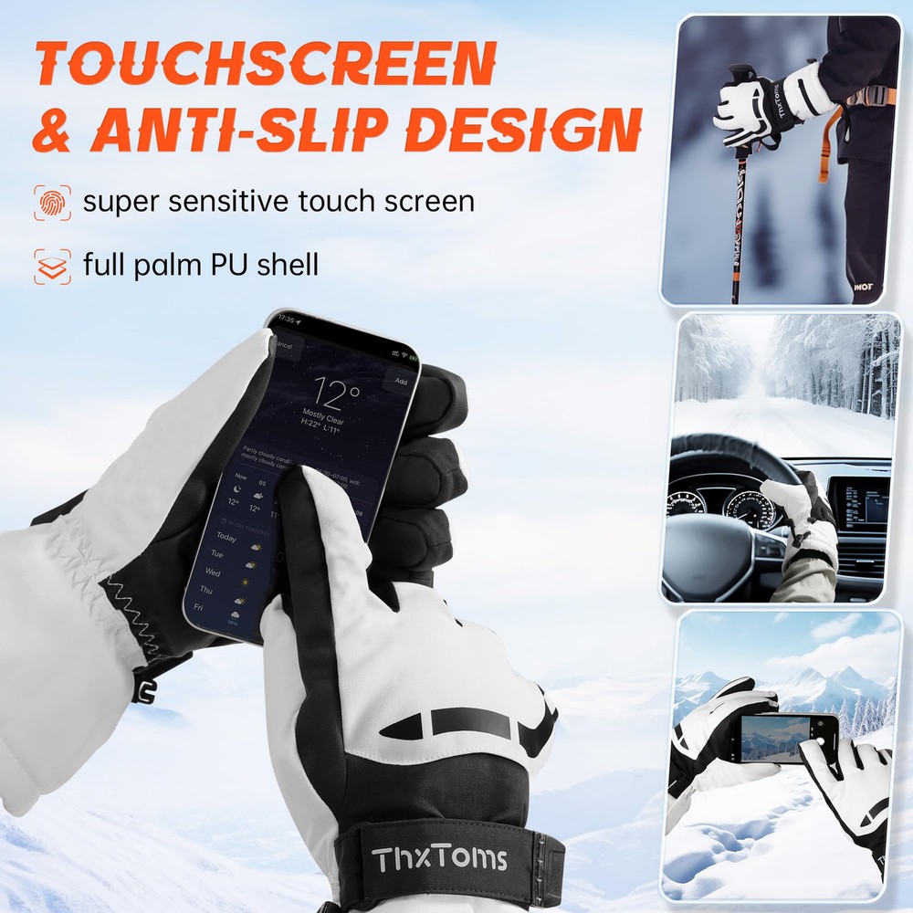 【Superior Warmth】: Our Ski Gloves feature 3M Thinsulate Insulation for exceptional warmth, keeping your hands cozy in cold weather conditions. The spray-bonded cotton provides excellent loft and insulation. 【Waterproof and Breathable】: Equipped with a TPU breathable waterproof membrane, our gloves keep your hands dry and comfortable while allowing moisture to escape. This prevents water infiltration and maintains optimal breathability. 【Enhanced Grip and Durability】: The gloves have a nylon shell with a full palm PU grip, offering exceptional slip resistance and durability. You can have a firm hold on your ski poles or other equipment, even in challenging conditions. 【Innovative Design Features】: Designed with practicality in mind, our gloves include features such as adjustable magic straps for a personalized fit, windproof cuff with drawstring to keep out snow and wind, anti-loss strings to prevent misplacement, and touchscreen compatibility on three fingers for convenient device use. 【Touchscreen Compatibility】: Designed for convenience, the gloves offer three-finger touchscreen capability, with full coverage touch-sensitive fingertips on the index finger for improved sensitivity. Compared to most gloves in the market with single-sided touchscreen compatibility, our gloves provide more sensitive touch response with full coverage.