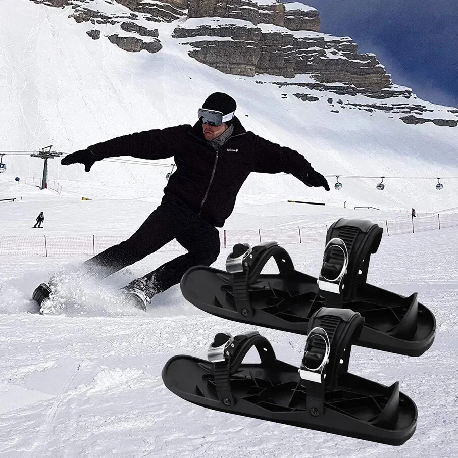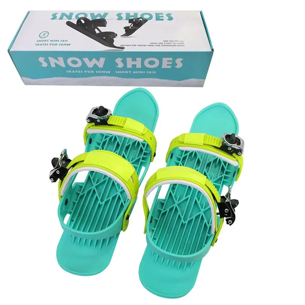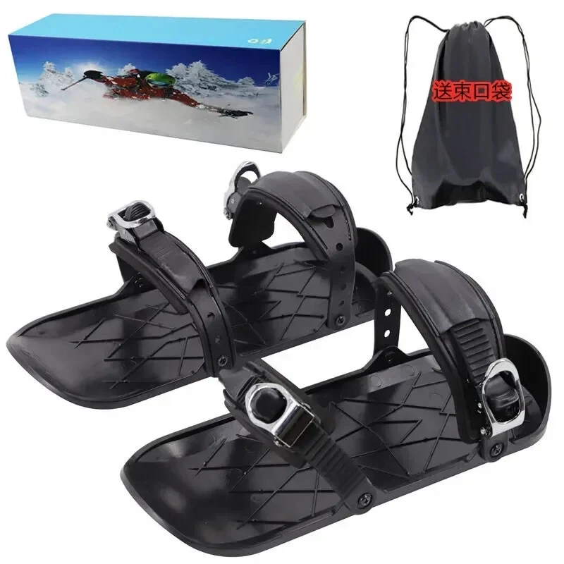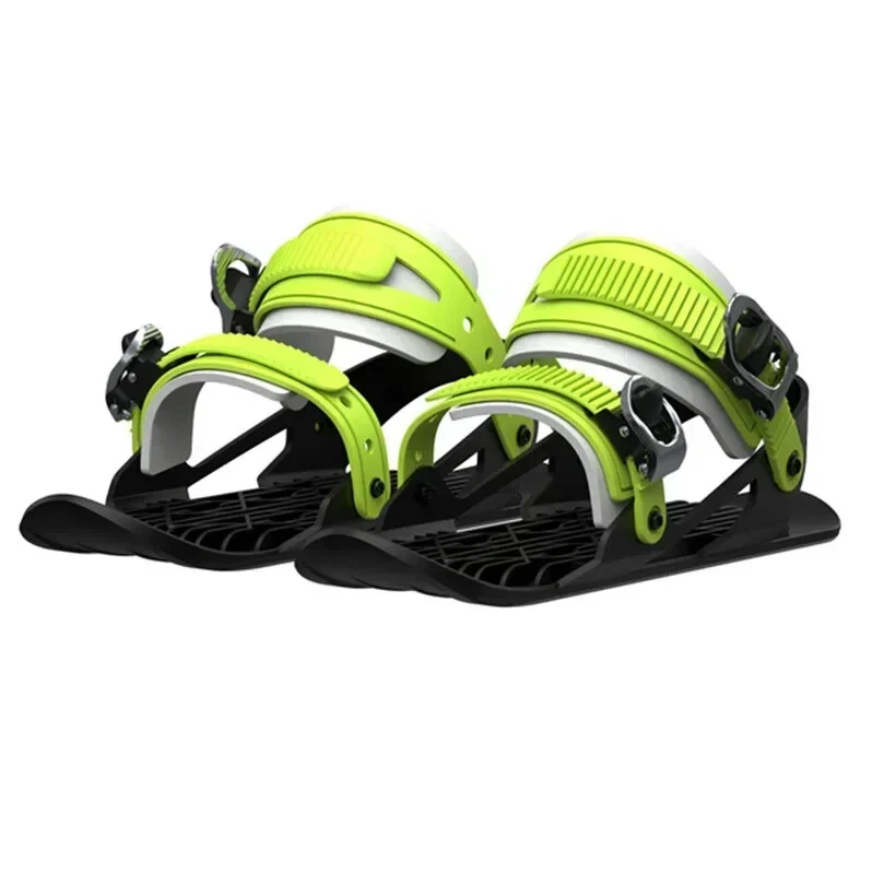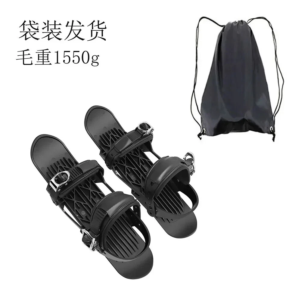 The set includes: 1 pair of shoes, 1 pair of protective goggles, 1 pair of warm gloves, 1 portable bag+color box for shipping Outdoor travel, snow skiing, snowboarding shoes, snow walking, snowboarding [Product Name]: Mini Ski Skates [Product Material]: ABS+Nylon+Aluminum Alloy [Product Color]: Black Green 【 Product Size 】: One size fits US 5-14 EU35-48 [Product size]: 44 * 15 * 13cm 【 Product Weight 】: Box: 1850g Bundle Pocket: 1550g (1 pair) 【 Packaging Size 】: Color box size: 45 * 15 * 13cm [Packing Specification]: 54 * 48 * 48cm 12 pairs/box gross weight 23 kilograms Generation 1: Product weight: Box: 1700g Bundle pocket: 1552g (1 pair) (Packing specifications): 60 * 40 * 38.5cm 12 pairs/box gross weight 20.5kg 50 * 40 * 40cm 10 pairs/box gross weight 18 kilograms Second generation: [Product weight]: Net weight 1052 grams [Product Packaging]: Black Bundle Pocket 45 * 35cm 1085g English color box packaging 37 * 15 * 10cm 1280g 【 Packing Specification 】: Bundle bag packaging 12 pairs/box 50 * 40 * 40cm, approximately 14kg Color box packaging 14 pairs/box 60 * 40 * 38.5cm, approximately 19kg Children's edition: [Product size]: 39 * 12 * 8cm 【 Suitable Size 】: 32-40 [Packaging size]: 39 * 14.5 * 12cm 【 Product Weight 】: Box: 1180g Bundle Pocket: 1000g (1 pair) [Packing Specification]: 60 * 40 * 38.5cm 14 pairs/box gross weight 18 kilograms 60 * 40 * 38.5cm 16 pairs/box gross weight 17 kilograms Children's products need to be shipped in a bundled bag. Please take a box and leave a note A combination of skiing and ice skating. Ski shoe accessories that turn shoes into mini skis Snow feet can be directly fixed to winter shoes or ski boots. Adjustable straps can be connected to any shoe. One size fits all. We recommend wearing snowshoes in sizes 5-14 US/35-48 EU. It can fit into any bag, so you can carry it with you. You don't need ski boots or any other heavy and expensive equipment. Made in Guangdong, China. The product is made of highly durable ABS nylon reinforcement material. The metal skiing edge can be easily stopped. Landslides on slopes, snow parks, hiking trails, or simply enjoying fun in local sleds or backyards.