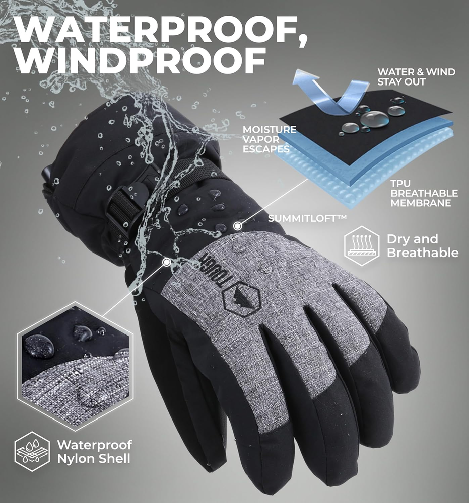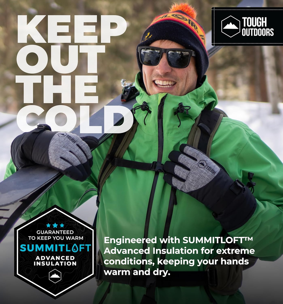 Product Description Tough Outfitters Snow and Ski Gloves Your hands have never met warmth and comfort like this. With Summitloft thermal insulation fit for even the most extreme sub-zero temperatures, a waterproof and wind-resistant nylon shell that will keep you warm and dry when you go out into the elements, and a TPU breathable membrane that allows sweat and moisture to escape as you turn up the heat doing your favorite activities, we’ve got you covered, warm, and dry. Crafted with a synthetic leather palm, a tough, reinforced all-nylon outer layer, and dual seams for extra strength and durability, our winter gloves will be there with you for as long as you can still shovel your own driveway or throw a snowball. These gloves have Summitloft thermal insulation fit for even the most extreme sub-zero temperatures. Guaranteed to keep you warm. With breathable TPU membrane that wicks out sweat and moisture rapidly you turn up the heat doing your favorite activities, ensuring your hands to stay dry. Constructed to add warmth and protection from elements. With waterproof and wind-resistant nylon shell that will keep you warm and dry when you go out. From hitting the mountains for a ski, snowboard, or snowmobile trip to working outdoors or shoveling snow in the dead of winter, our ski gloves will keep you warm and dry. Fit for extreme cold temperatures and all the snowball fights you can handle, our ski gloves will keep you toasty even in the dead of winter. Featuring a double layer of synthetic leather over the entire palm, our winter gloves will help you get a better grip on your ski poles or snow shovel. We reinforced our winter gloves in every place we could — double seams, double faced knuckles, fingers, and palms, and a drawstring wrist closure to keep the snow out, all ensuring total durability while the nylon shell construction keeps this glove lightweight. Available in five sizes ranging from XS to XL, you’re sure to find the perfect fit. Our gloves are designed to maintain your dexterity and move with you, rather than resist you. An adjustable wrist strap with a buckle adds extra reinforcement to keep everything where it’s supposed to be.
