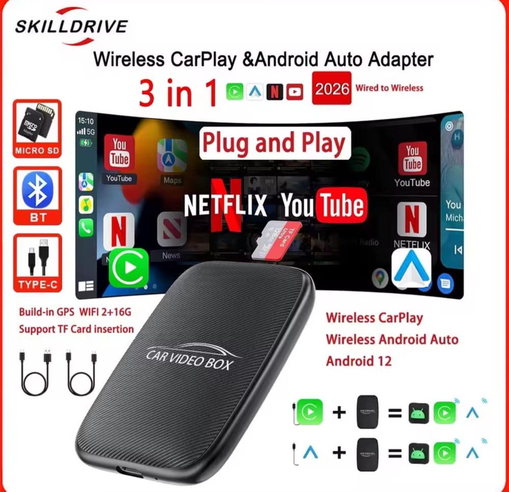 SkillDrive 2026 Car Ai Box 3 in 1 Wireless CarPlay Android Auto Adapter TV Box on YouTube Netflix Car Intelligence System Android 12.0 Newest Version