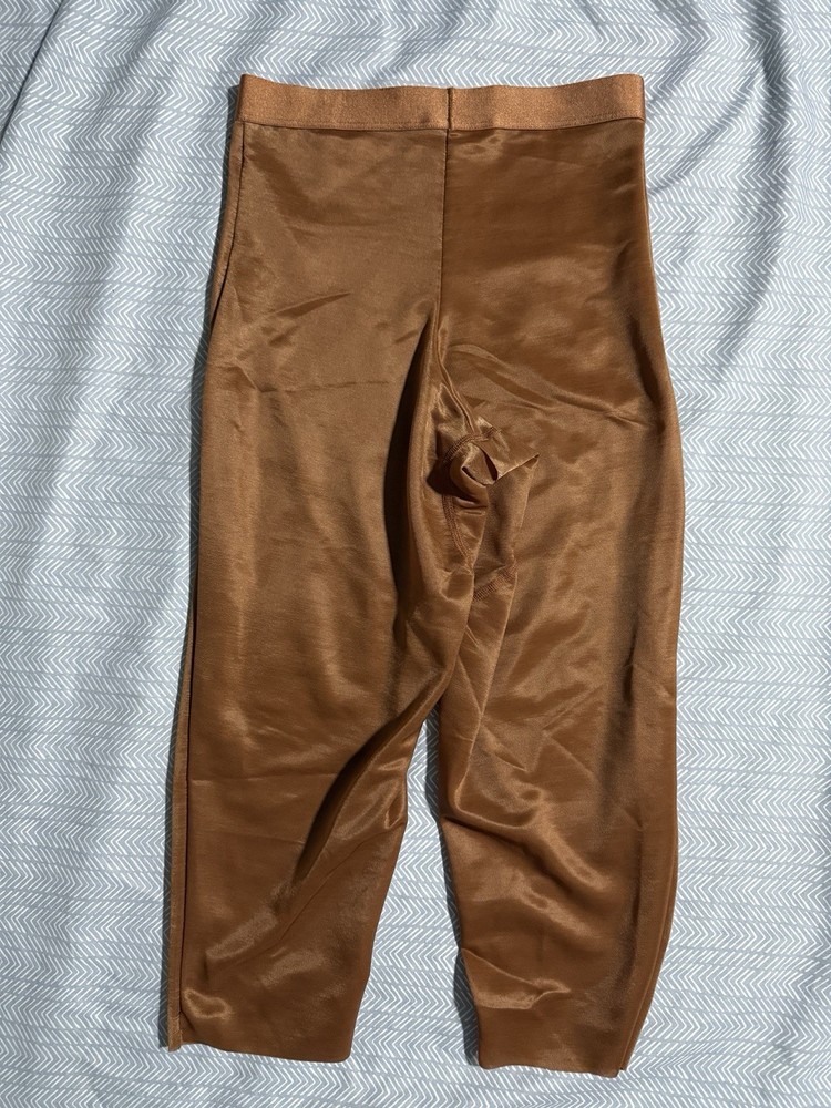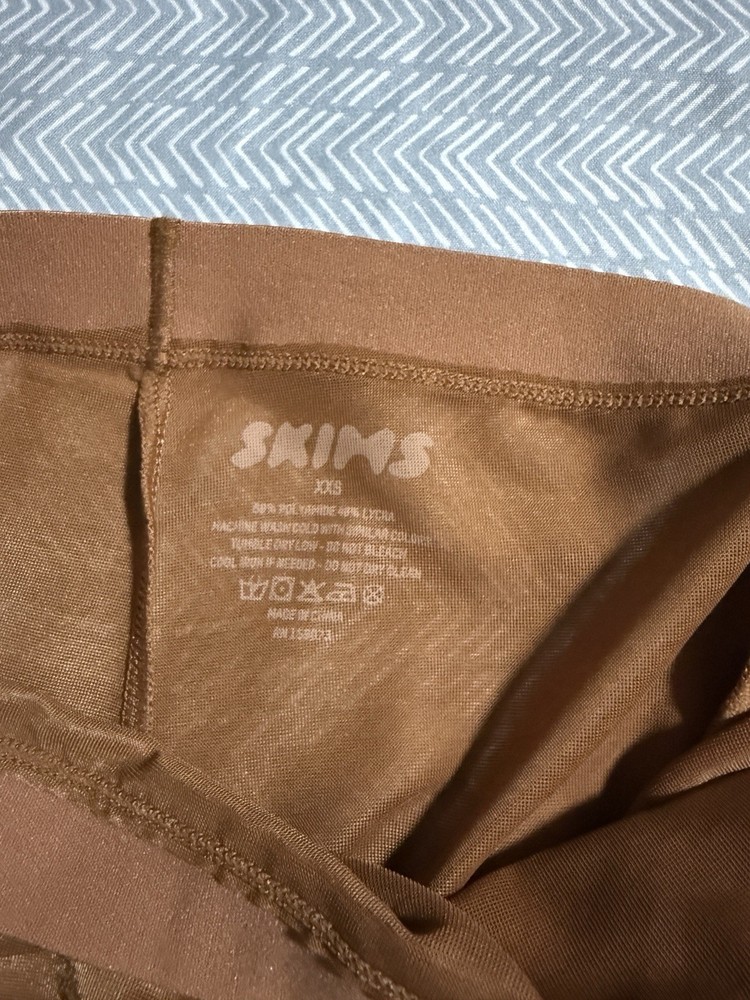 This product is a new pair of Skims brown shapewear shorts in size XXS. It is designed for the waist, abdomen, and leg areas with a seamless and opaque fabric. The shapewear is machine washable and features a wireless underwire type. Perfect for women looking to smooth and shape their body, this shapewear is a high-quality product from the popular brand Skims.