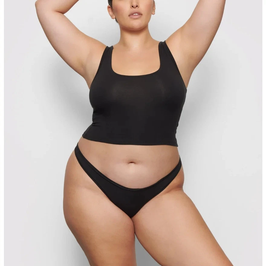 Skims Camel Cotton Jersey Dipped Thong Panty Featuring a dipped front and high cut fit, this flattering throwback thong underwear style is updated in a stretchy cotton material for comfort. Dip Front Thong, Designed To Style To Wearers Preference (High Or Low On Hips), Thong Back For No Visible Panty Lines, 100% Cotton Jersey Gusset Lining, Special Pickstitch On Waist And Leg Opening For Added Design Detail Yumi Is Size 14 And 5’11”, Wearing A Skims 2x 90% Cotton / 10% Spandex Machine Wash Cold pn-dth-0271 Color - Camel Size 4x Approximate Measurement: waistband - 14" across New with tags, no flaws. Stock photo is the same style, different color. Smoke free, dog friendly home.