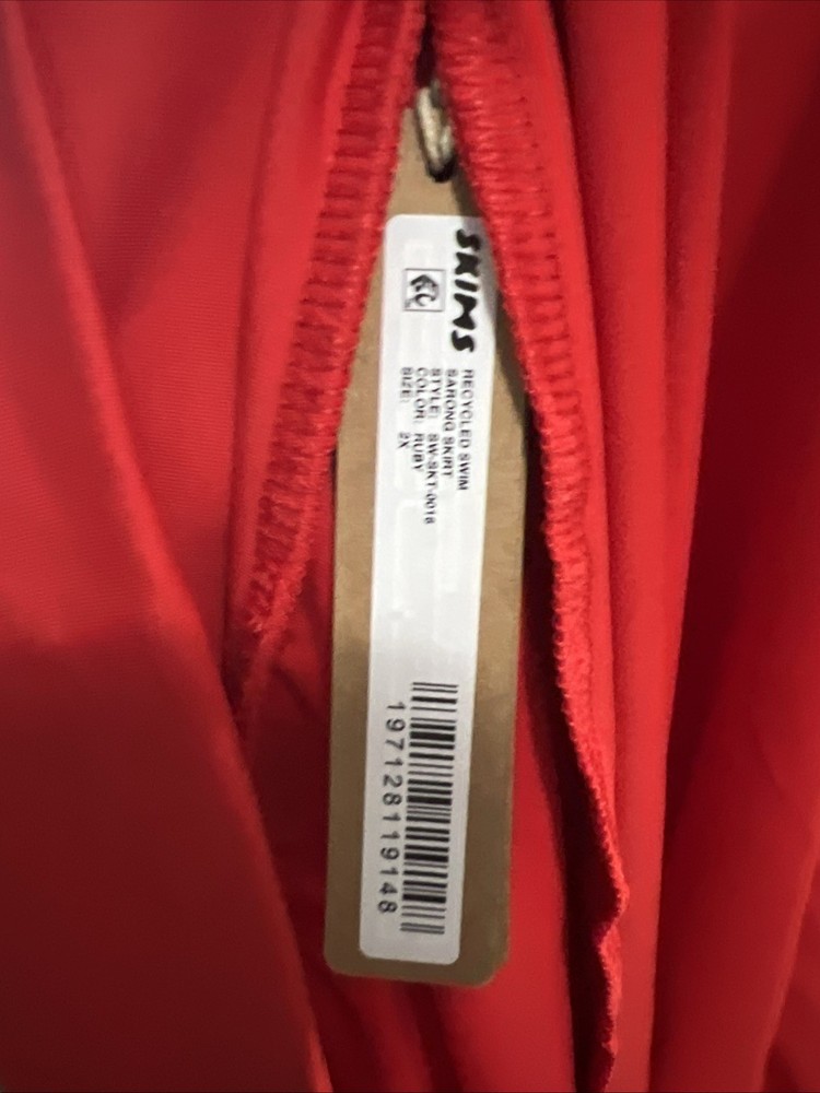 The Skims Recycled Swim Sarong Skirt in size 2X Ruby is a plus-size cover-up designed specifically for women. This stylish swim skirt features a vibrant ruby color, perfect for adding a pop of color to your beach or poolside ensemble. Made from recycled materials, this sarong skirt is not only fashionable but also eco-friendly, making it a great choice for those who want to look good while also being conscious of their environmental impact. Ideal for women who want both style and sustainability in their swimwear choices.
