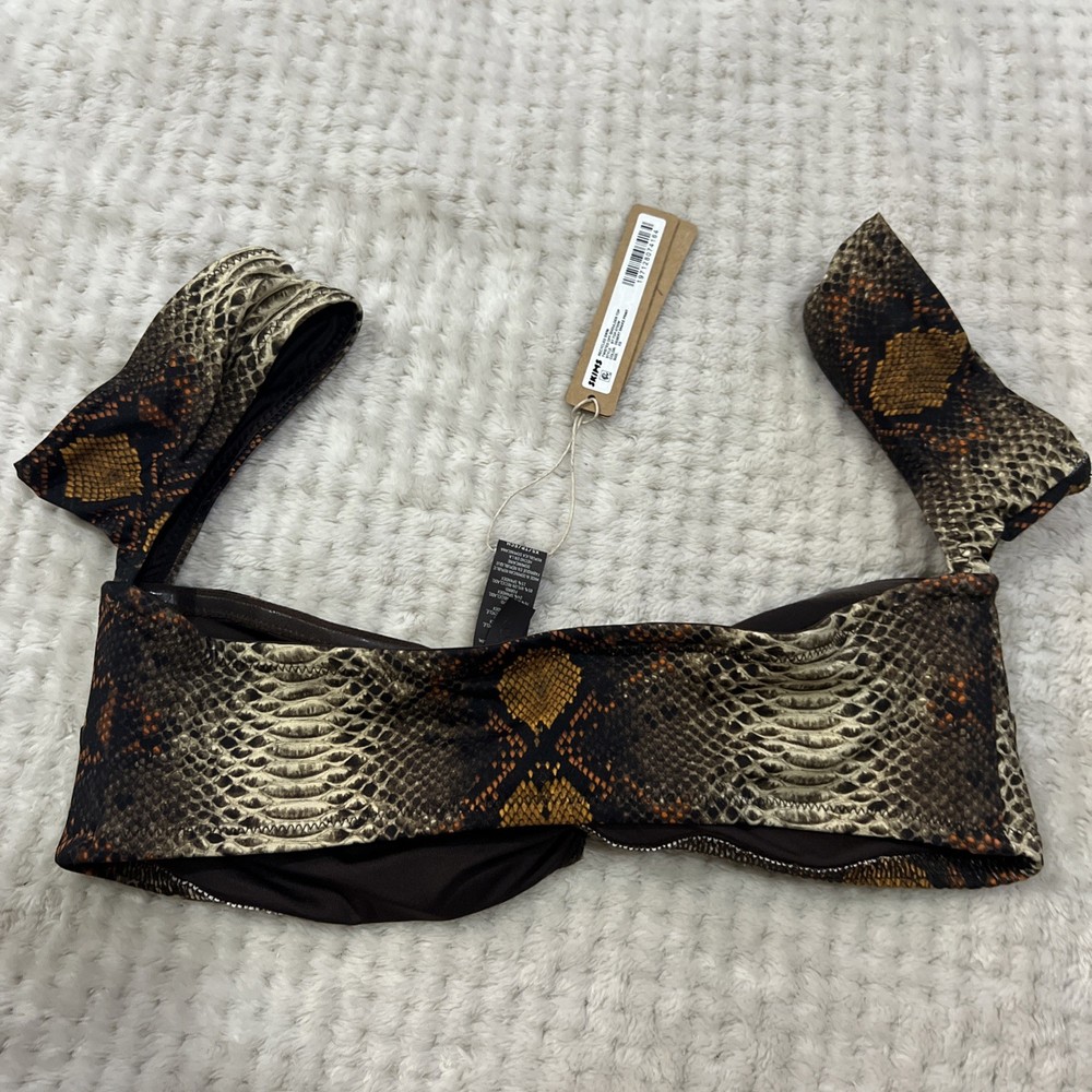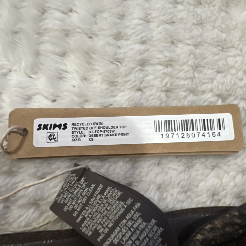 The Skims Recycled Swim Twisted Off-shoulder Top in size XS features a stylish and trendy design in a desert snake print. This top is perfect for women looking to make a statement at the beach or pool. The off-shoulder style adds a touch of elegance, while the vibrant multicolor print adds a fun and playful element to the swimwear collection. Made by the popular brand Skims, this top is sure to make a stylish addition to any woman's swimwear collection.