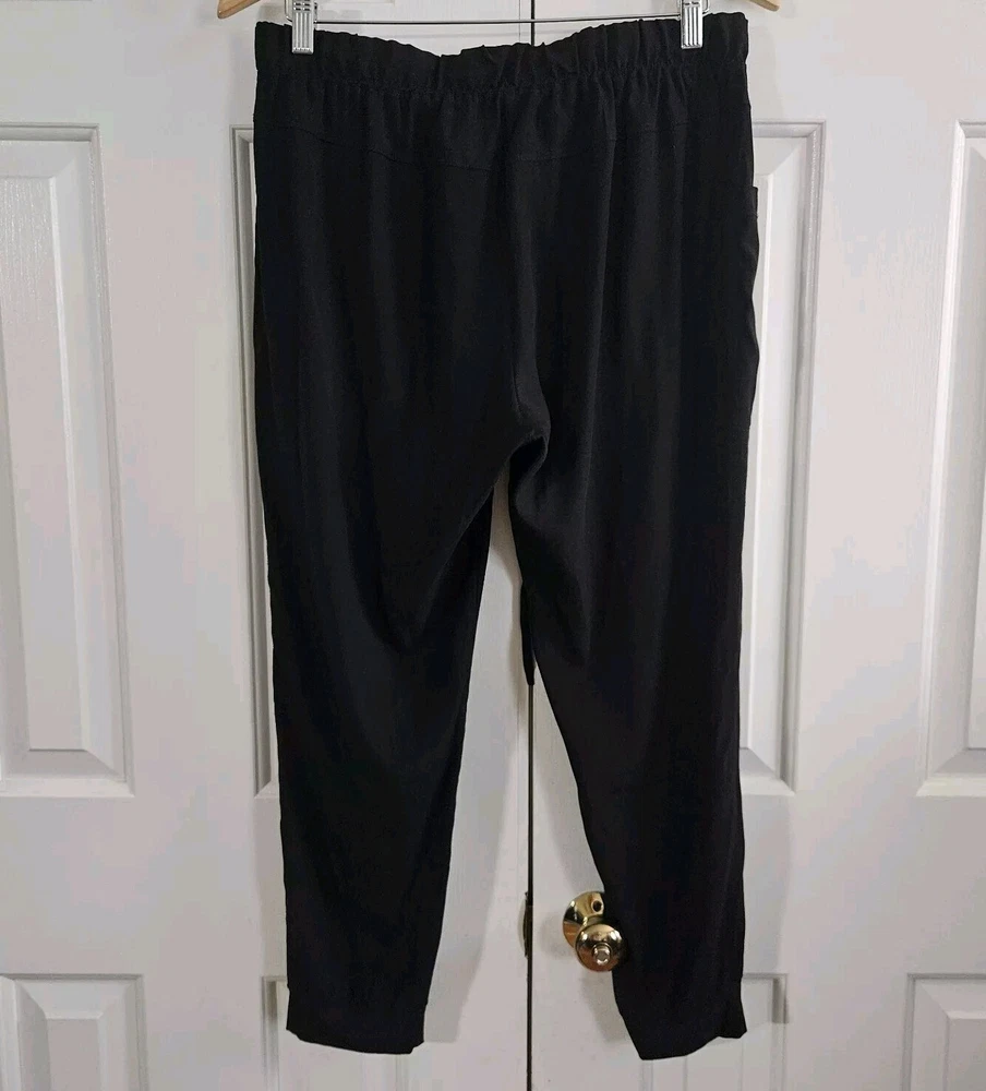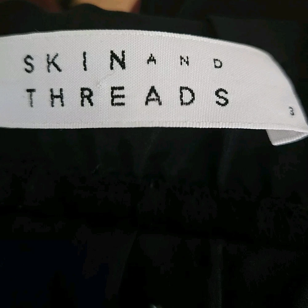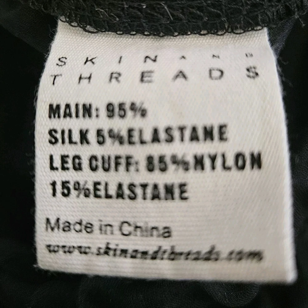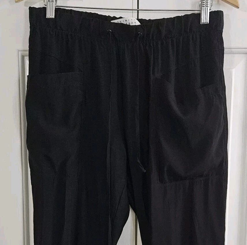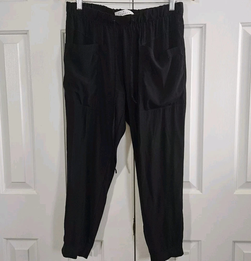Skin and Threads Womens Silk Pull on Pants Good pre-owned condition, no flaws 95% silk, 5% spandex, cuff is 85% nylon, 15% elastane Elastic waist with drawstring Cargo pockets in the front Very lightweight Pockets at hips Marked a size 3 Approximate measurements 16 inches across waist when not stretched, it stretches to 19 inches 11.5 inch rise 25.5 inch inseam
