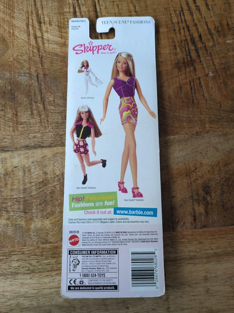 This is a vintage Skipper fashion doll clothing set from 1999, designed by Mattel under the Teen Scene Fashions line. The set includes a blue dress and shoes, suitable for an 11.5-inch girl doll. It is an original outfit for Skipper, the younger sister of Barbie, and is part of the Fashion Doll category.