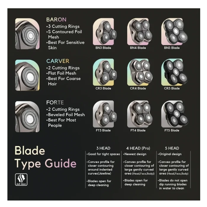 Product details Experience a faster, more comfortable shave with the Skull Shaver Carver PRO 3 Head Replacement Blades. Crafted from premium Japanese stainless steel, these blades offer exceptional contouring, superior performance, and a seamless shaving experience. Featuring a built-in vacuum system to capture hair and prevent mess, the Carver PRO blades are designed for a closer, irritation-free shave, whether you prefer wet or dry shaving. Compatible with all Pitbull, Palm, and Butterfly Kiss shavers, these versatile blades allow you to find the perfect fit for your grooming needs. : Choose from three styles of Skull Shaver PRO blades—Carver, Forte, and Baron—to find the perfect fit for your grooming needs. Whether you have coarse hair, sensitive skin, or prefer a specific cutting performance, there's a style designed just for you.