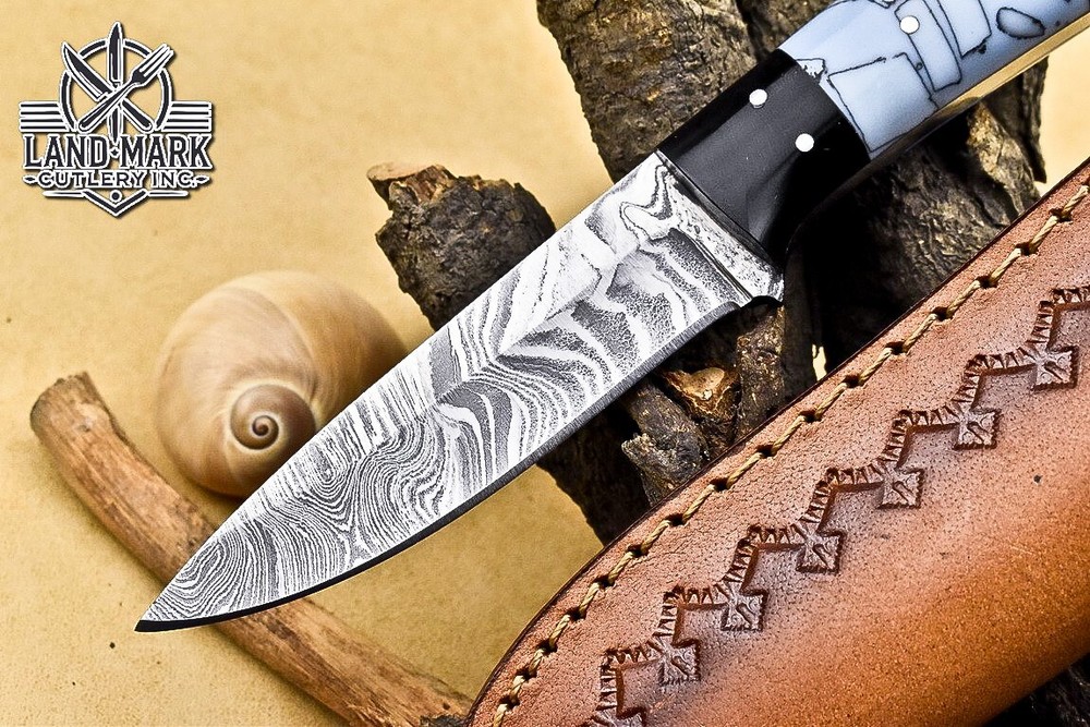 Custom Hand Made DAMASCUS STEEL HUNTING KNIFE WITH RESIN HANDLE We offer a shipping discount for More then one purchased . And discount will be apply on combine invoice, Discount will not apply on separate payment. ITEM DETAILS OVER ALL LENGTH 8.0 inches long (Approx) HANDLE LENGTH 4.0 inches long (Approx) BLADE LENGTH 4.0 inches long (Approx) BLADE HARDNESS 58-60 HRC Which Holds The Sharp Edge For Long Time. HANDLE RESIN COVER LEATHER SHEATH This Awesome custom made KNIFE has a nice hand forged with the combination of 4340 & 1080 steel. HOW OUR DAMASCUS IS MADE: All our Damascus is real and not just an acid etch. Damascus is a mixture of 1080HC and 4340 nickel carbon. You heat them up together and then fold the bar over and over to get the desired layers, ours are 396 layers. Then you burn the blade in acid, and it turns the nickel satin color and the high carbon turns blackish gray. This is how the layers are exposed to show the layers of the new steel created coined "Damascus". All Damascus is acid etched to show the layers. If you high polish the metal it will be shinny satin like all steels. Only after you burn the sides of the blade with acid do you see the layers of the two steels. Makes sense? After we make our knives we high polish the handles and put an edge on the blade. The high polishing buffs off the acid burned layer of the handle, and the blade edge is sharpened and the acid burned edge becomes satin. You can re-burn the tang of the blade near the handles and the edge of the blade and it will show the layers once more. All our knives are hand made, durable and unique ***** YOU WILL RECEIVED THE SAME KNIFE Qality Standards Our Damascus blades are made from high quality non-stainless steels which rival or exceed any Damascus blade made from the 10 series with 4340. Our Damascus combination has taken years to perfect and has been tested under a variety of application which will offer professional performance in categories of toughness, strength (lateral stress) and edge honing and holding ability. In a 5 spot Rockwell test our blades will average near or close to 58 which offers a perfect balances between its toughness and strength.Our blades due to carbon content need to be regularly treated with wax and/or 3 in 1 oil to maintain its superior quality. Questions if you have any question feel free to send us message we aim to answer all questions within 24 hours Feedback If you are not satisfied with our service please contact us before leaving any negative or natural feedback. We will resolve all issues as quickly as possible. Disclaimer We are not responsible for any injuries associated with the use of our tools. Our products are intended for legal use only by responsible buyers. Therefore, we will not sell our products to anyone under the age of 18. Before bidding please check your country laws as some countries Custom don't allow this. If your purchase is held by Custom Authorities in your country/State we will not be responsible for that and no refund will be issued Shipping We offer a 20% shipping discount for More then one purchased . And discount will be apply on combine invoice, Discount will not apply on separate payment We ship within 24 hours after receiving complete payment but this can be delayed due to week ends or Governments and Religious Festivals . . This is beyond our control and we apologize for this inconvenience. Precautions Our Tools are very sharp so open and use them very carefully We are not responsible for any injuries associated with the use of our tools Tips to Care knife 1. NEVER STORE YOUR KNIFE FOR LONG TIME IN LEATHER SHEATH. 2. LEATHER CAN ABSORB WATER, WHICH WILL RUST THE KNIFE. 3. ALWAYS CLEAN THE BLADE AFTER USING WITH OIL OR WAX