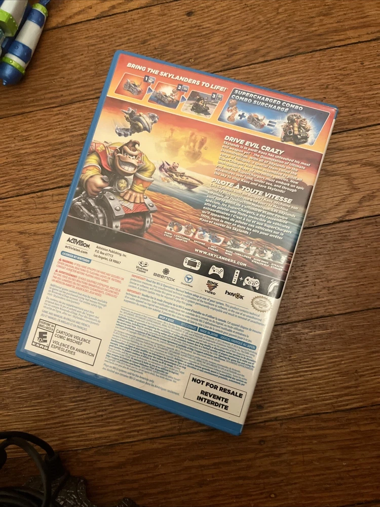 Game Name:Skylanders SuperChargersRating:E-EveryonePlatform:Nintendo Wii URegion Code:NTSC-U/C (US/Canada)Country/Region of Manufacture:United StatesPublisher:ActivisionVideo Game Series:skylandersRelease Year:2015Genre:Action & Adventure, Family/Kids, Racing