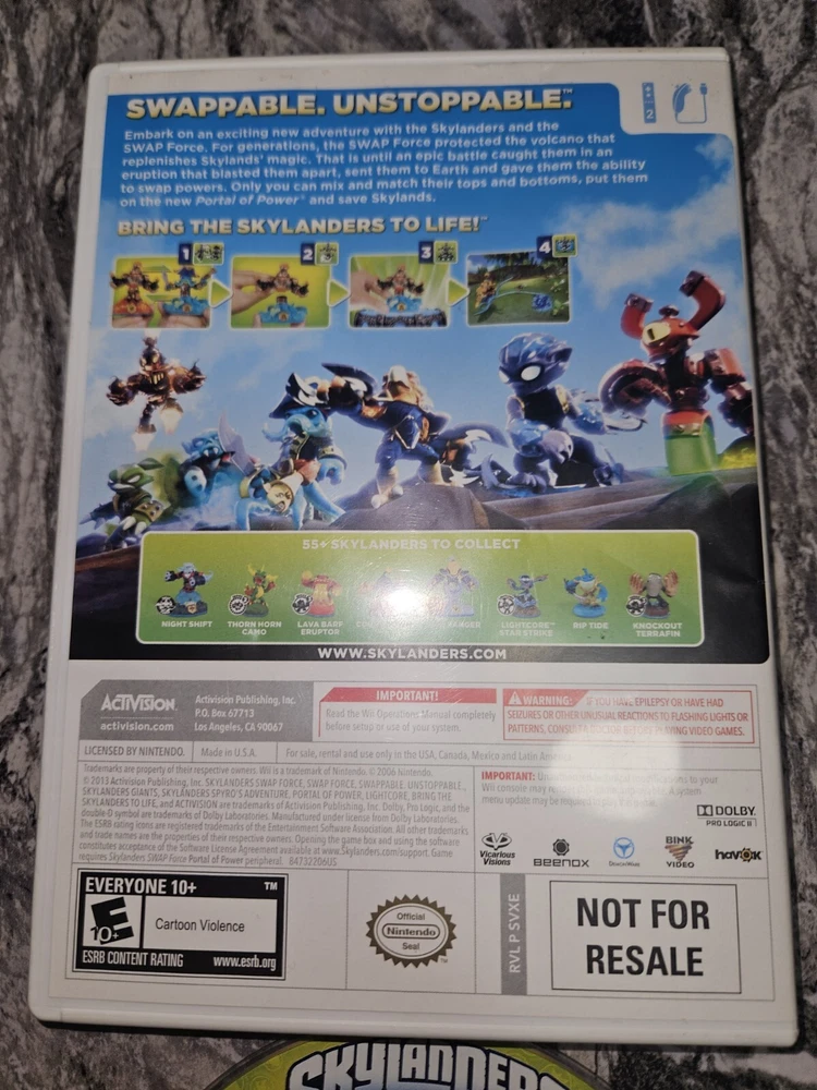 Region Code: NTSC-U/C (US/CA) Rating: E10+ (Everyone 10+) Genre: Action & Adventure Game Name: Skylanders Swap Force Platform: Nintendo Wii Publisher: Activision