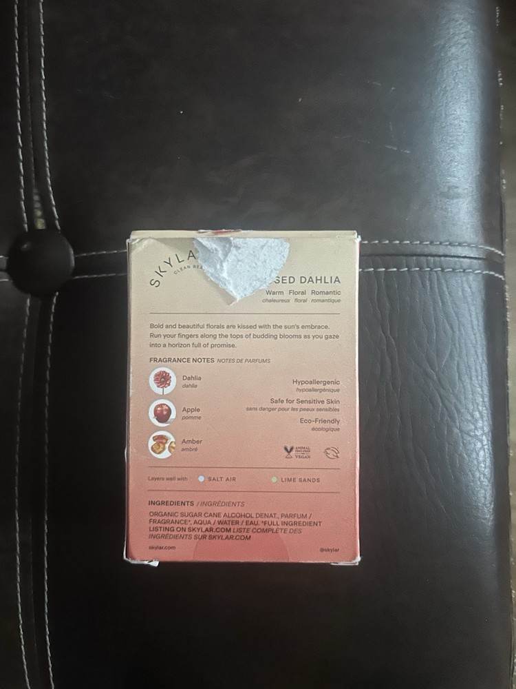 Indulge in the warm, radiant scent of Skylar Sunkissed Dahlia, a hypoallergenic and eco-friendly fragrance designed for sensitive skin. This luxurious blend features notes of dahlia, crisp apple, and amber, creating a fresh yet comforting aroma perfect for any occasion. Details: • Brand new, never used • Size: 50ml / 1.7 fl oz • Hypoallergenic, safe for sensitive skin • Vegan & cruelty-free • Box is lightly damaged (see photos), but the bottle is untouched and in perfect condition Retail price: $90 – Get it here for less!
