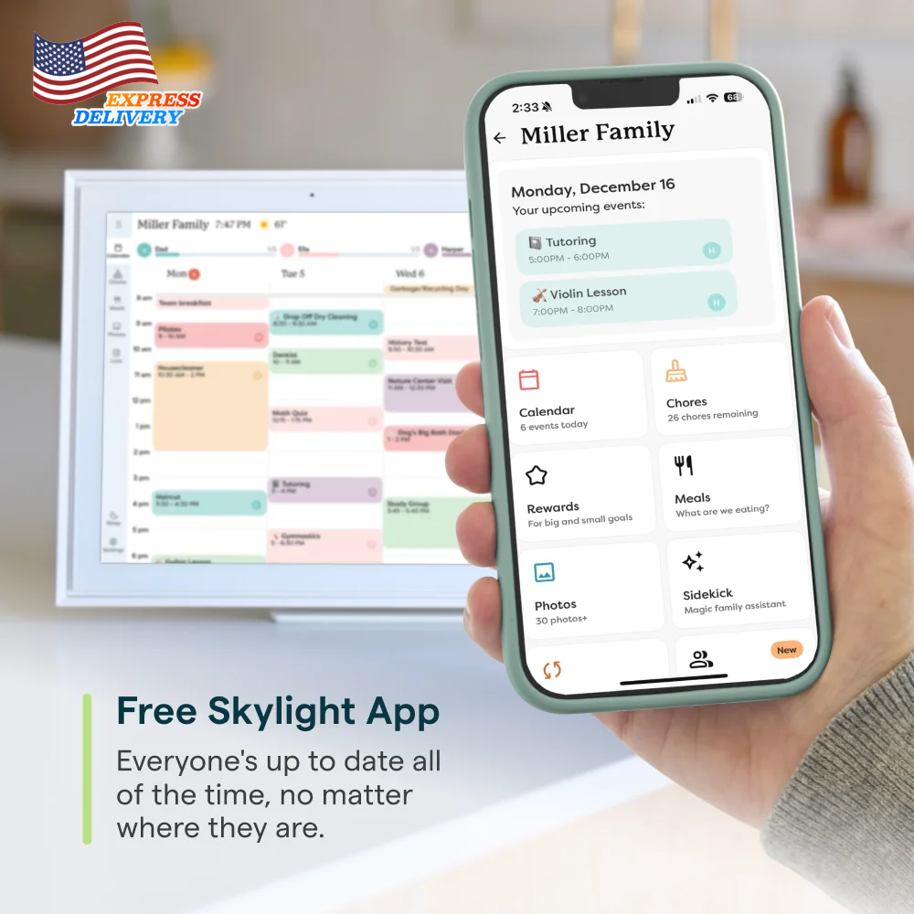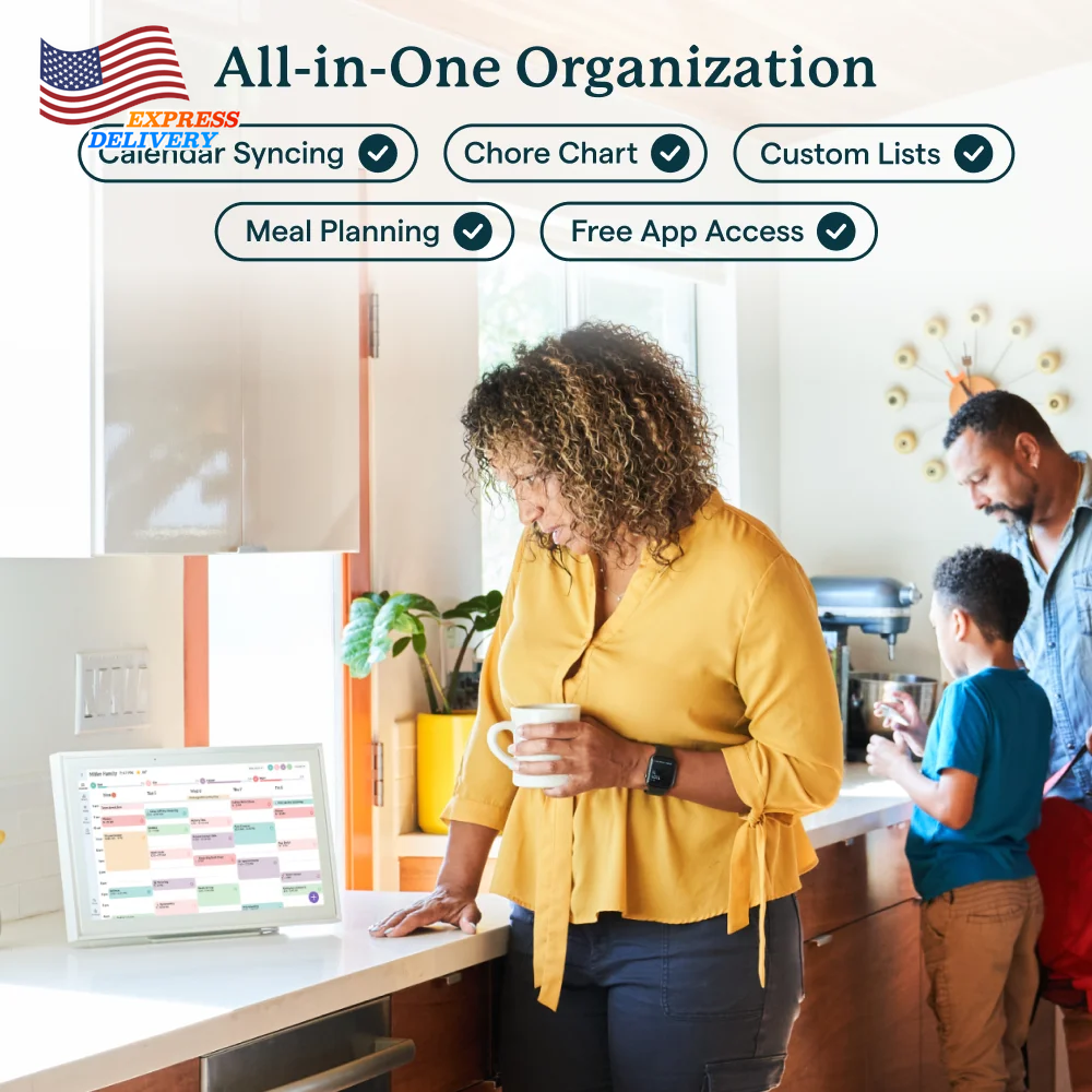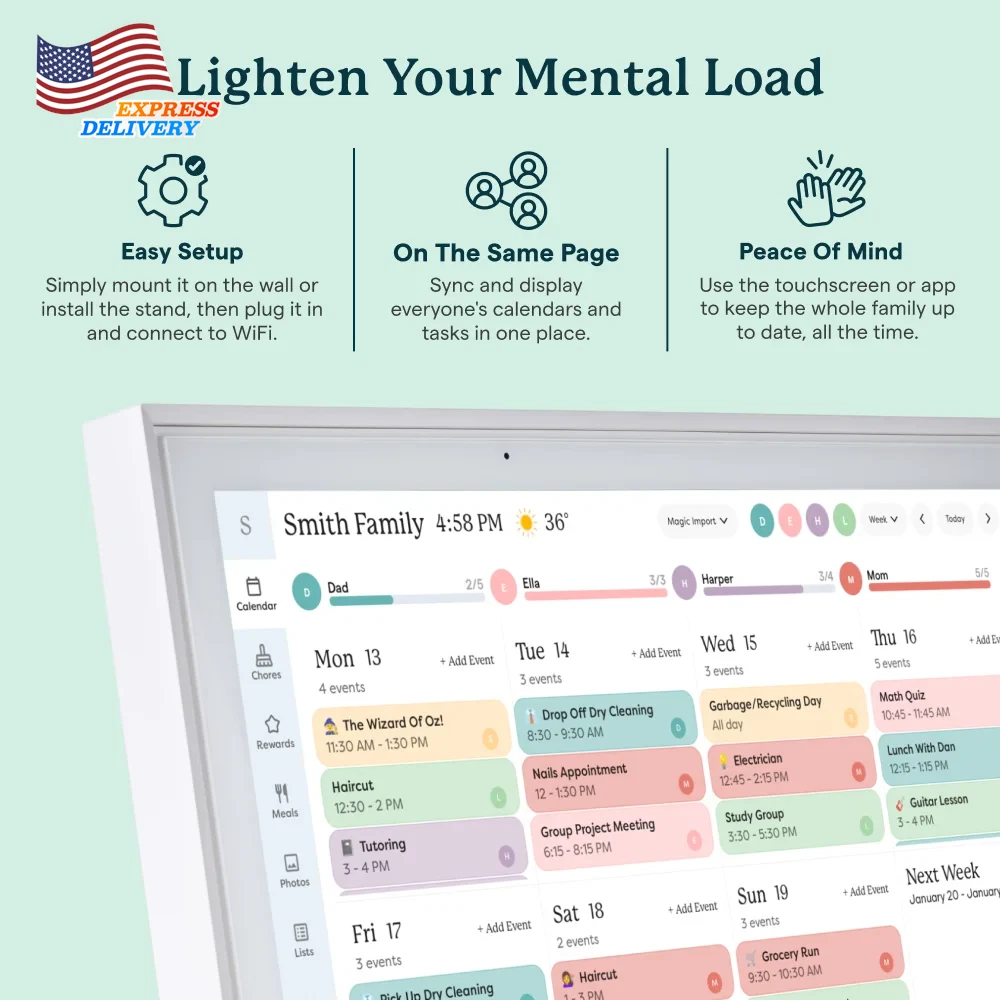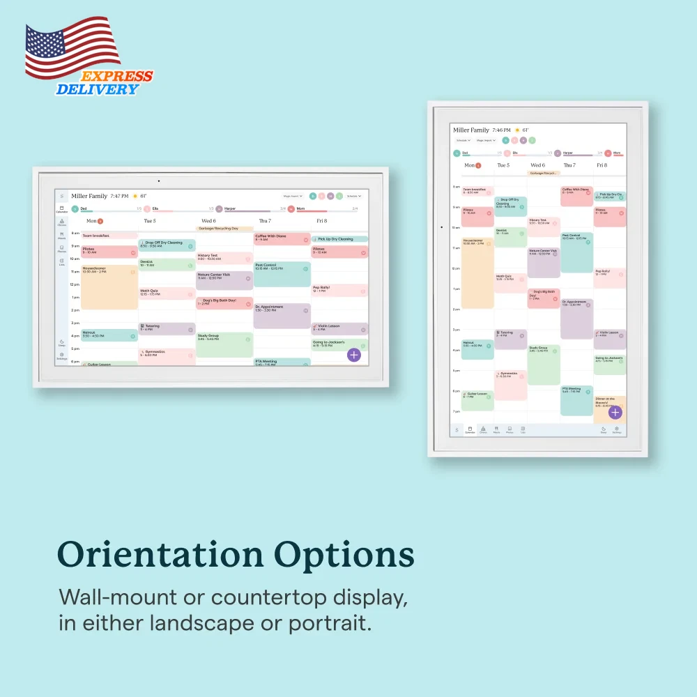 Stay organized with the Skylight 15-inch All-in-One Touchscreen Family Calendar and Chore Chart. This WiFi-connected digital family calendar allows you to sync your calendars, manage chores, and plan meals for the whole family. The high-quality metal stand and wall mount provide flexible placement options, while the companion mobile app keeps you informed from anywhere. With its intuitive interface, this smart family calendar is the perfect solution to keep your household running smoothly. The 15-inch touchscreen calendar can be mounted on the wall or displayed on a high-quality metal stand (included). Connect the electronic digital family calendar to your home's WiFi network and sync it with your Google, iCloud, Outlook, Cozi, or Yahoo calendars to keep your family's schedule organized. Add and edit events, chores, and meal plans directly on the touchscreen display or through the free mobile app, making it easy to stay on top of your family's activities. Utilize the interactive chore chart to encourage healthy habits and independence, and never wonder "what's for dinner?" again with the built-in meal planning feature. Download the Free App to Stay Informed From Anywhere: Access and manage everything on your Skylight Calendar through the mobile app. The Basic Plan offers core features like Meal Plans, Sync Online Calendars, and a Chore Chart. For additional tools, the optional premium Plus Plan provides features such as Magic Import, Photo and Video Screensaver, and advanced Meal Planning, replacing the single-slot Dinner Plans for more flexible meal management. Backed by a 1 year warranty, this all-in-one digital family calendar and chore chart is the perfect solution to keep your household organized and running smoothly.