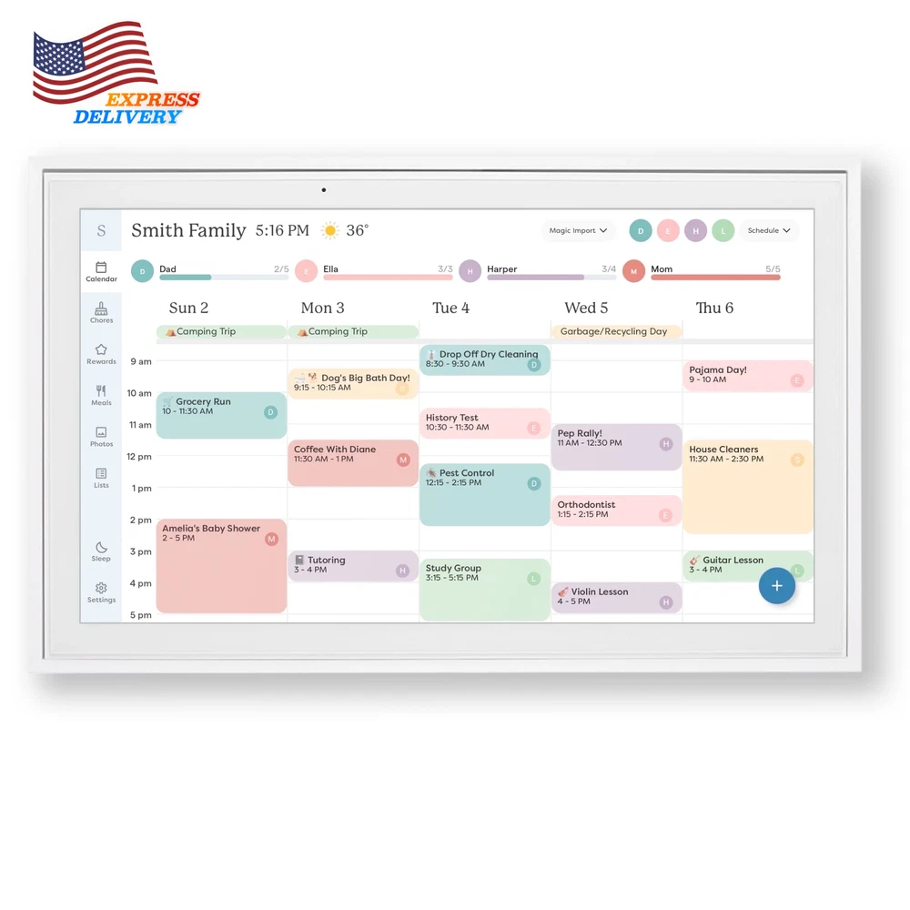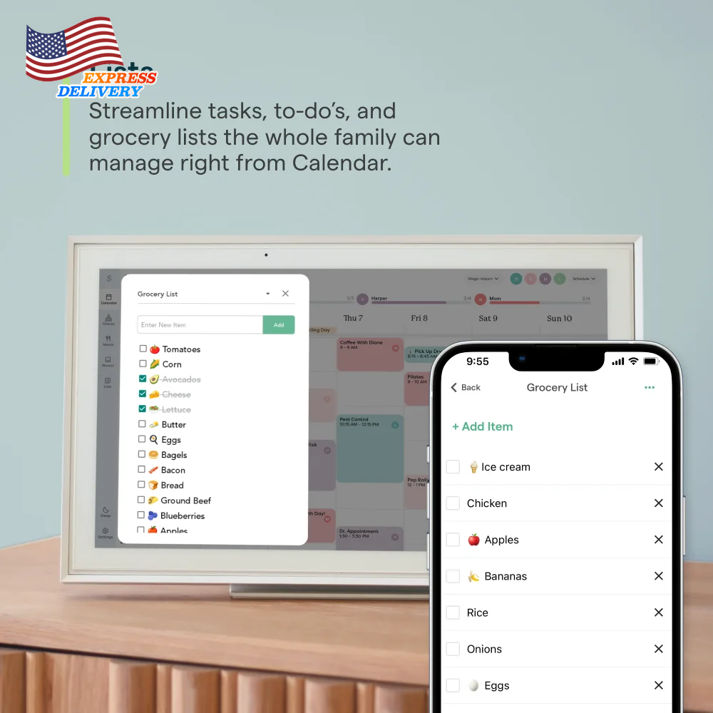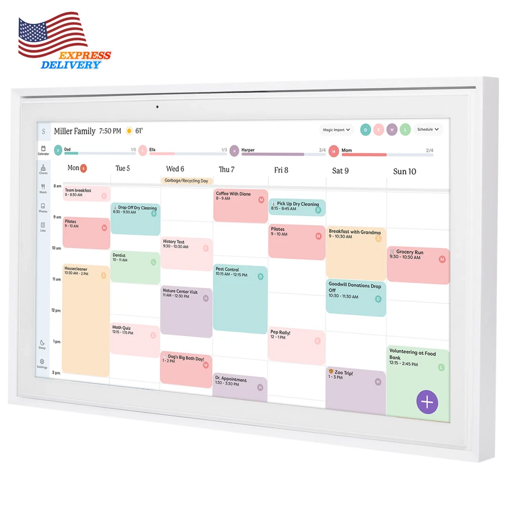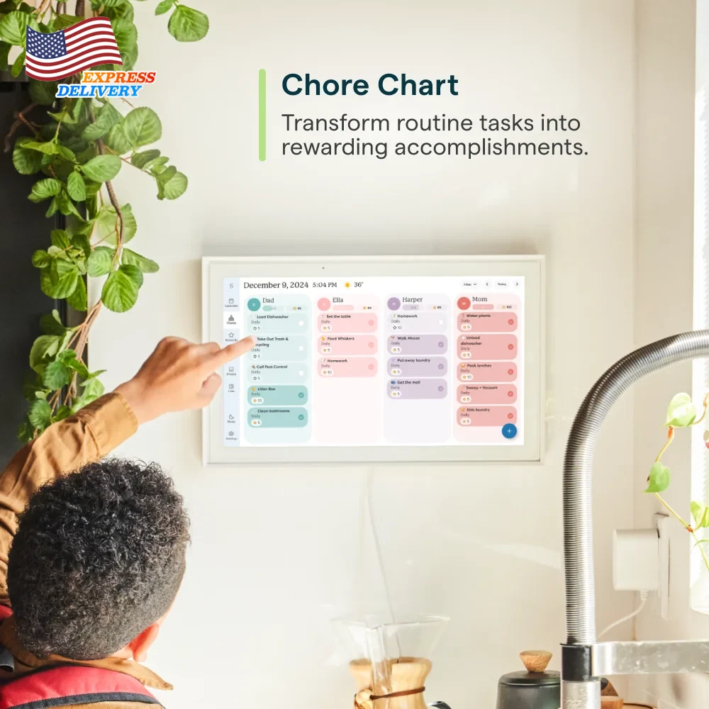 Stay organized with the Skylight 15-inch All-in-One Touchscreen Family Calendar and Chore Chart. This WiFi-connected digital family calendar allows you to sync your calendars, manage chores, and plan meals for the whole family. The high-quality metal stand and wall mount provide flexible placement options, while the companion mobile app keeps you informed from anywhere. With its intuitive interface, this smart family calendar is the perfect solution to keep your household running smoothly. The 15-inch touchscreen calendar can be mounted on the wall or displayed on a high-quality metal stand (included). Connect the electronic digital family calendar to your home's WiFi network and sync it with your Google, iCloud, Outlook, Cozi, or Yahoo calendars to keep your family's schedule organized. Add and edit events, chores, and meal plans directly on the touchscreen display or through the free mobile app, making it easy to stay on top of your family's activities. Utilize the interactive chore chart to encourage healthy habits and independence, and never wonder "what's for dinner?" again with the built-in meal planning feature. Download the Free App to Stay Informed From Anywhere: Access and manage everything on your Skylight Calendar through the mobile app. The Basic Plan offers core features like Meal Plans, Sync Online Calendars, and a Chore Chart. For additional tools, the optional premium Plus Plan provides features such as Magic Import, Photo and Video Screensaver, and advanced Meal Planning, replacing the single-slot Dinner Plans for more flexible meal management. Backed by a 1 year warranty, this all-in-one digital family calendar and chore chart is the perfect solution to keep your household organized and running smoothly.