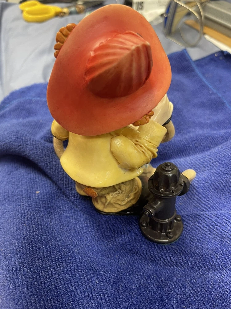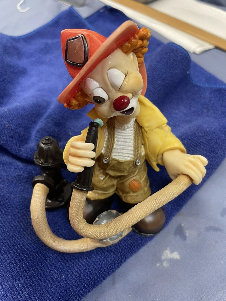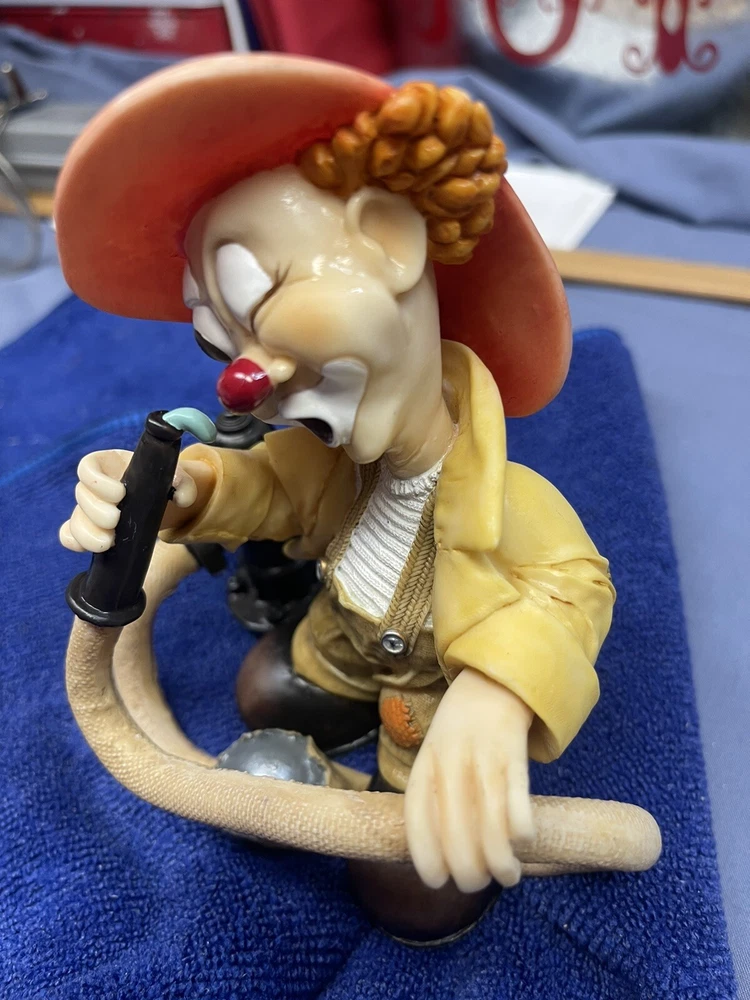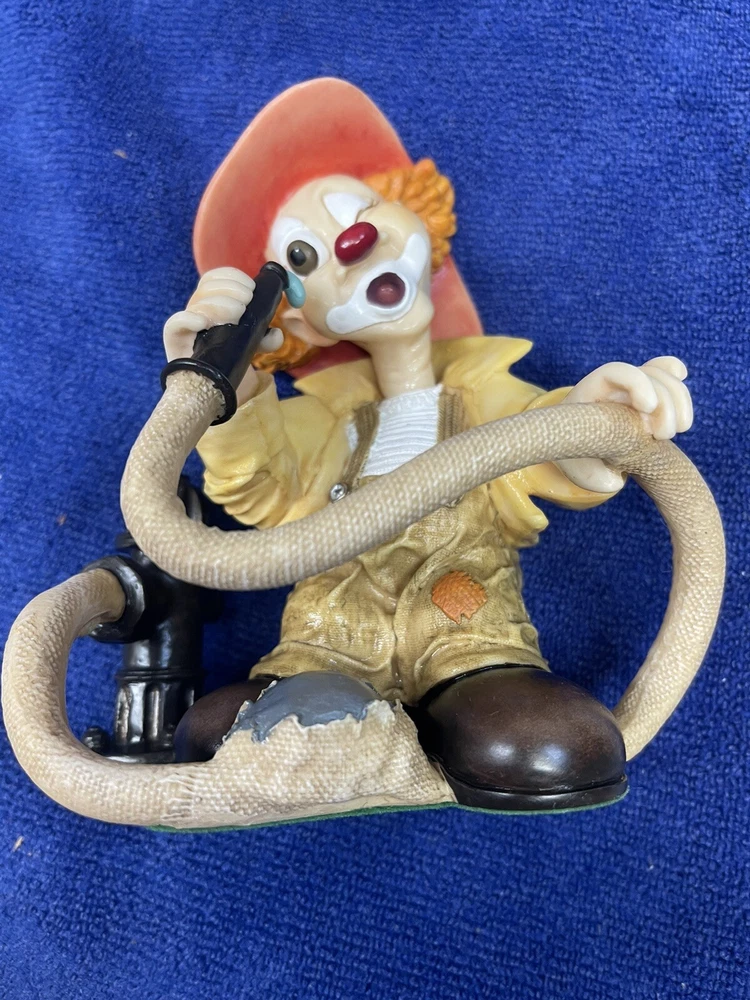 This unique figurine features a charming clown holding a fire hose, with a playful expression on his face. The resin material and intricate details make this a wonderful addition to any collection. The item was manufactured in 1997 and is a vintage piece from the Clay Art brand. It's perfect for collectors of figurines or those who appreciate unique decorative items.