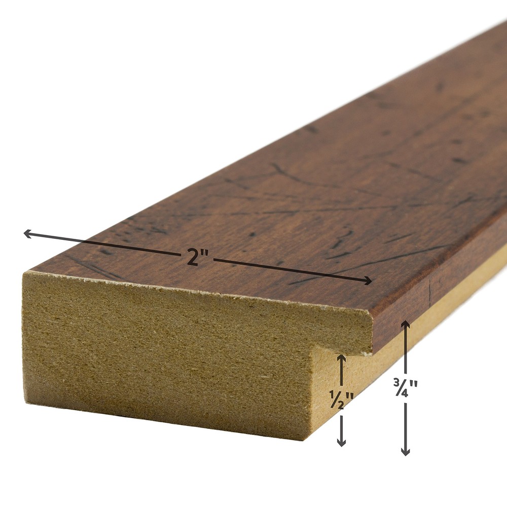 Country Rustic style; dark brown; distressed pine appearance; smooth wrap finish Frame includes: glass, rigid black backing and pre-attached stamped hanging hardware Frame holds a 4 inch by 6 inch photo/print (viewable area is slightly smaller) Frame moulding is 2 inches wide; wood composite material Made in the U.S.A.