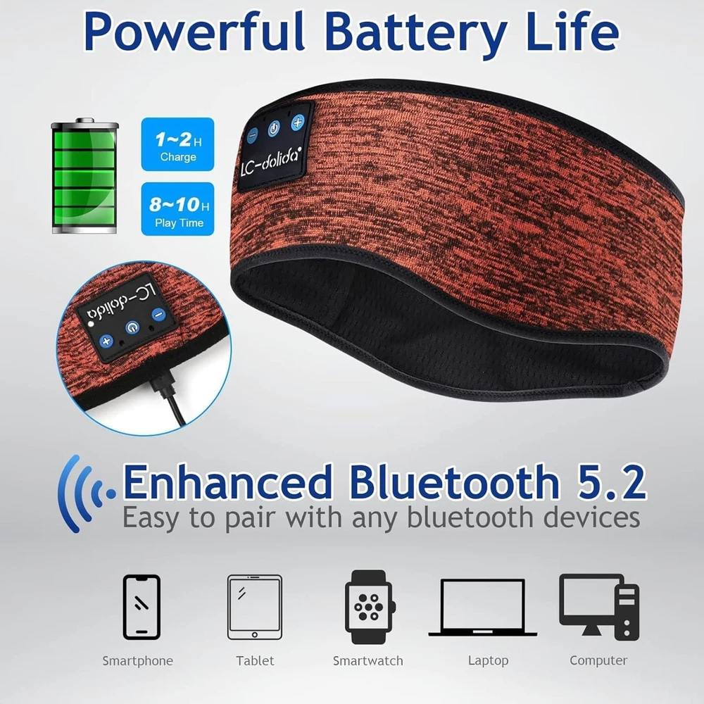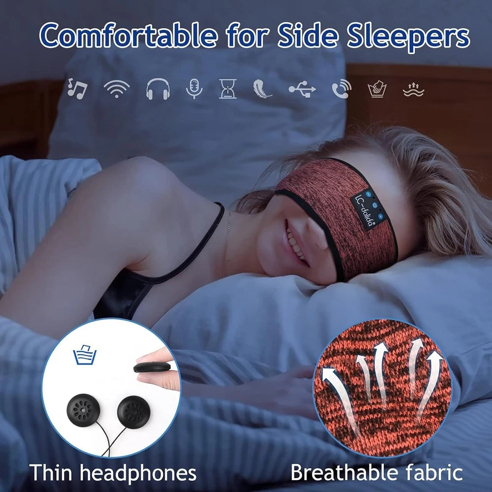Sleep Headphones & Sports Bluetooth Headband & Bluetooth Sleep Mask 3 in 1: Sleep headphones feature a Breathable headband design with wireless headphones inside that allows you to listen to music without having to wear additional headphones and protects you from being disturbed by your mess hair and sweat. Sleep headphones headband headphones are perfectly suitable for travel, gym, running, yoga as well as sleeping. Sleep Headphones with Ultra-Thin Speakers: Sleep headphones bluetooth headband headphones integrate the earpieces into a soft fabric headband for your extra comfort and the speakers are so thin that you can't feel them even if you press your head against the pillow, perfect sleep headphones for side sleepers. Choose sleep headphones to keep you away from noisy environments and have a sweet dream. Bluetooth 5.2 and Long Battery Life: Headband headphones feature with latest Bluetooth 5.2 chip, fast paring speed, less power consumption, Bluetooth headband pair with any Bluetooth-enabled device that's within 45 feet, Compatible with Most Devices. Ensure stable clear sound and lossless music even if the headphones are in sports. Bluetooth headband to be charged for 2 hours, the talk time/music playback time can reach 10 hours. Comfortable, Breathable and Washable Bluetooth Headband: Sleep Bluetooth headband headphones are nestled into an extremely stretchy fabric and a breathable mesh lining, that's not only soft but also very skin-friendly, and will easily stretch to fit all head sizes. Because the earphones can be detached, You can wash and dry the bluetooth headband in any household machine without damaging the speakers. Best Gift Choice: If you have any quality problems or questions. Feel free to contact us, we are pleased to help you. Cool tech gifts for Thanksgiving Day, Christmas Stocking Stuffers, Secret Santa gifts, Birthday, Mother's Day, Valentine's Day, and many other gift-giving occasions.