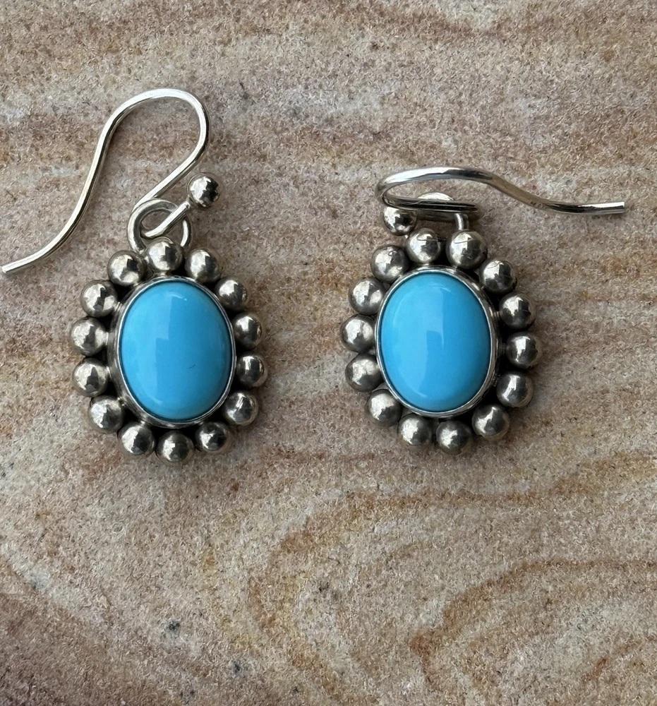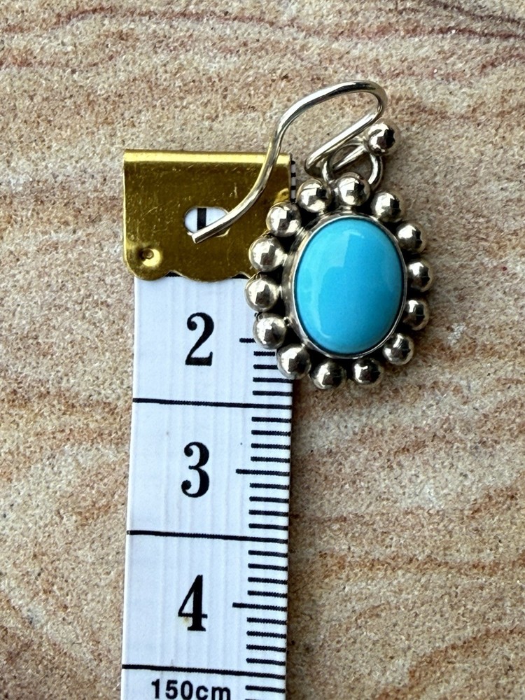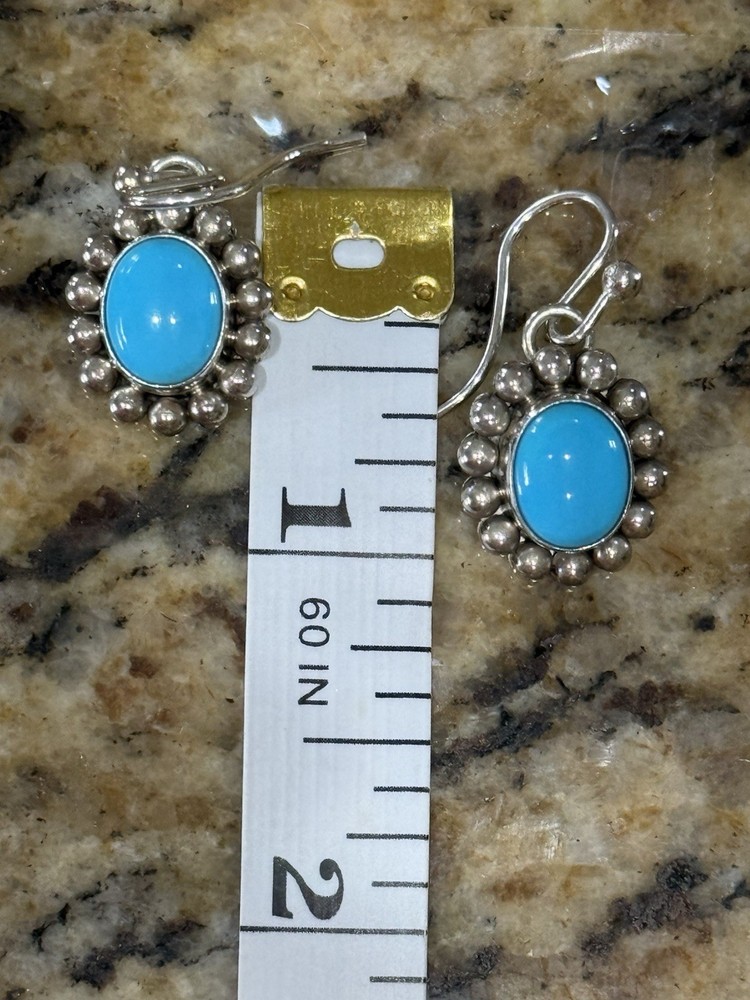 Like new out of the case. Rare wear. Approximately 5/8” long setting plus the hook drop. Stone approximately 8mm by 5mm. See the photos for the inch and the centimeter (millimeters) tape measures. These are also your description to details. Sleeping Beauty turquoise from the AZ Mine is increasingly scarce and collectible. The hooks are 0.925 sterling silver also and the earrings are stamped. Setting composed of individually hand made beads which is unique to Artie Yellowhorse and her signature “rising sun” design.
