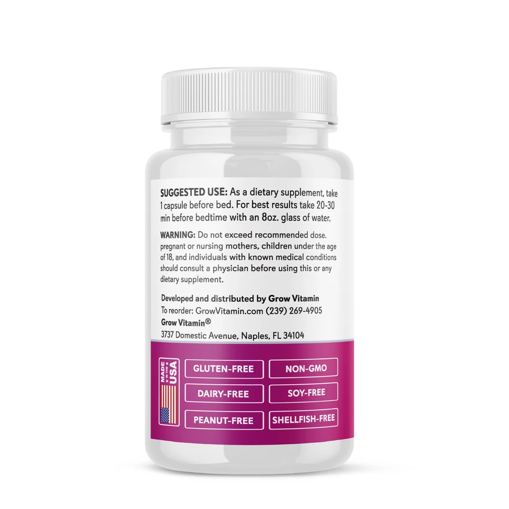 GROW ELEVATED WELLNESS Formulated for Restful, Recharging Sleep Support Grow SLEEP PRO-HEALTH is an advanced nighttime calm & recovery blend crafted with amino acids, herbal extracts, and key micronutrients to help you relax at night so you can show up refreshed the next day.* Advanced Nighttime Calm & Recovery Blend 458 mg Premium Sleep Blend 60 Capsules ? 60 Servings Key Sleep Support Highlights 15 Calming Ingredients Includes L-theanine, tryptophan, GABA, Fo-ti root, and more to support a relaxed nighttime state.* Supports Restful Sleep* Helps You Unwind* Non-GMO Ingredients Made in the USA Why You?ll Love SLEEP PRO-HEALTH Thoughtfully designed for those evenings when you want to ease into relaxation and prepare your body and mind for a restorative night?s rest.* Benefit 01 Promotes Calm Nighttime Relaxation* A synergistic blend of L-theanine, tryptophan, GABA, and glycine supports a sense of calm so you can gently transition from busy days into a more relaxed nighttime rhythm.* Benefit 02 Supports Restful, Productive Sleep Cycles* Crafted to complement your body?s natural ?rest & digest? response, helping you make the most of the hours you spend asleep and wake up feeling more ready for the day ahead.* Benefit 03 Nightly Recovery & Reset* Adrenal and pituitary glandulars, Fo-ti root, and supportive nutrients like vitamin C, B3 (niacin), and magnesium help nourish your system while you rest, so you can feel more balanced by morning.* Benefit 04 Easy, Once-Daily Capsule Just one capsule taken about 30 minutes before bedtime fits seamlessly into your evening routine?no complicated protocols required. What?s Inside Each Capsule A premium blend of vitamins, minerals, amino acids, herbal extracts, and glandulars?carefully selected to support your nighttime relaxation experience.* Core Vitamins & Minerals Foundational Micronutrient Support Vitamin C (from acerola cherry) ? 3 mg (3% DV) Calcium (from calcium lactate) ? 7 mg (<1% DV) Niacin (from niacinamide) ? 18 mg (112% DV) Magnesium (from magnesium citrate) ? 8 mg (2% DV) Everyday micronutrient support* Backed by recognizable forms Grow Vitamin® Proprietary Blend 458 mg Premium Nighttime Blend Fo-ti root extract (24:1) L-theanine & tryptophan Glycine & GABA (gamma-aminobutyric acid) DMAE (dimethylaminoethanol, from DMAE bitartrate) Rehmannia root powder ( Rehmannia glutinosa ) L-glutamine Adrenal substance (suprarenal, bovine) Choline (from choline bitartrate) Adrenal pituitary substance (bovine) 15 calming ingredients* Amino acids & botanicals Designed for nighttime use Other ingredients: Gelatin capsules, magnesium stearate (vegetable source), silicon dioxide. How to Use Simple, consistent habits can make all the difference in your sleep routine. Take 1 capsule daily , about 30 minutes before bedtime . Swallow with a glass of water, with or without a light snack as tolerated. Use consistently for best results and pair with calm, screen-light?reduced evenings. Pro Tip: For a more complete nighttime ritual, combine SLEEP PRO-HEALTH with relaxing habits like dimming the lights, reading, gentle stretching, or breathwork. Supplement Facts Serving size & key information for SLEEP PRO-HEALTH. Supplement Facts Amount Per Serving %DV? Serving Size 1 Capsule Servings Per Container 60 Vitamin C (from acerola cherry) 3 mg 3% Calcium (from calcium lactate) 7 mg <1% Niacin (from niacinamide) 18 mg 112% Magnesium (from magnesium citrate) 8 mg 2% Grow Vitamin® Proprietary Blend 458 mg ** ? Percent Daily Values are based on a 2,000 calorie diet. ** Daily Value not established. Why Choose Grow SLEEP PRO-HEALTH? Thoughtful formulation, quality sourcing, and a modern wellness-first philosophy. Advanced nighttime calm & recovery blend made with 15 key ingredients for relaxation and nighttime support.* Non-GMO ingredients and produced in the USA . Crafted in facilities that follow GMP (Good Manufacturing Practice) guidelines for quality. Balanced for daily use at just one capsule per serving. Designed to pair with other healthy sleep habits as part of an overall wellness routine. Created by Grow to align with our mission: Elevate Wellness with Precision Science. Who Is This For? SLEEP PRO-HEALTH may be a great fit if you: Want support for relaxing in the evening after mentally or physically demanding days.* Prefer a capsule formula that combines amino acids, herbs, and glandulars in one serving.* Are building a more intentional bedtime routine focused on calm, comfort, and recovery.* Appreciate supplements that prioritize thoughtfully selected ingredients over unnecessary fillers. Frequently Asked Questions Have questions about how to use SLEEP PRO-HEALTH? Start here. When should I take SLEEP PRO-HEALTH? For most people, taking one capsule about 30 minutes before bedtime works well. You can adjust slightly earlier or later depending on how your body responds. Always follow the directions on the label, and speak with your healthcare provider if you have questions about timing or use. Can I take this every night? SLEEP PRO-HEALTH is formulated as a daily-use nighttime support supplement . Many people choose to take it consistently as part of their evening routine. If you are pregnant, nursing, taking medications, or have a medical condition, consult your healthcare professional before use. Does this product contain melatonin? No. This formula focuses on a melatonin-free blend of amino acids, botanicals, micronutrients, and glandulars intended to support relaxation and nighttime comfort without relying on melatonin.* Is this suitable for vegans or vegetarians? This product is encapsulated in gelatin capsules and contains bovine-derived glandular ingredients , so it is not suitable for strict vegans or vegetarians. Caution & Important Information Please read before use. Caution: Adults only. Do not exceed the recommended serving. Not intended for pregnant or nursing women. If you have a medical condition (especially endocrine, hormonal, or psychiatric conditio
