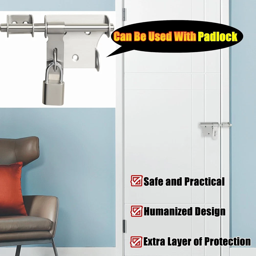 【Premium Quality Material】The bolt latches constructed from hi-q solid stainless steel, ensuring quality and longevity, strong and durable, not easy to rust and oxidation 【Hand Brushed Finished】The padlock latch is finished by hand fine polishing brushed, with smooth and pure surface, retaining the most original beautiful stainless steel color, which can resist daily scratches and corrosion 【Safe and Practical Design】Padlock can be installed with it, very practical and safe design, great security features to Offers Reliable Protection Against Intruders. 【Heavy Duty Design】10mm solid stainless steel latch rod, thickened metal latch body, one-piece molding without welding, heavy duty and strong design, greatly increased safety 【Come With Padlock】Includes padlock set, install with a padlock, add an extra layer of reliable protection; Applicable to all kind of bathroom doors,Fence Gate, French door, toilet, windows, barns, garage doors, pet doors, inside the door etc Product Description WIDELY USED Applicable To All Kinds of Doors 1 Interior Door 2 Barn 3 Pet Room 4 Fence 5 Front Door More Details About The Bolt Latch 1 2 3 4 5 6 Large Sise/6 Inch Two Sizes Are Available Heavy Duty With A Padlock Safe and Reliable Heavy Duty With A Padlock Safe and Reliable Small Size/4 Inch SET(With A Padlock)