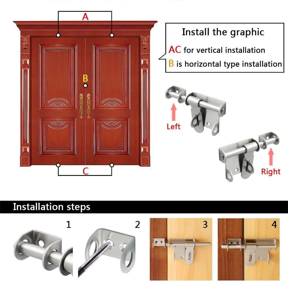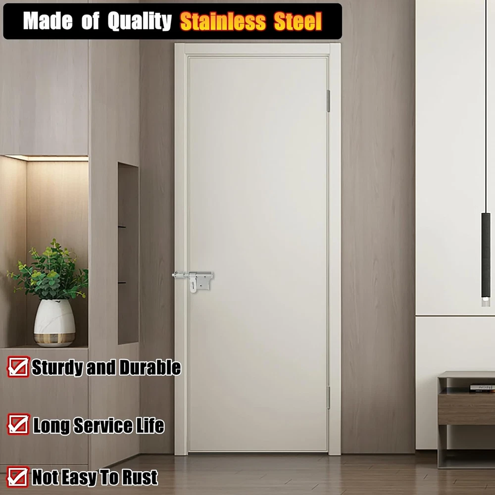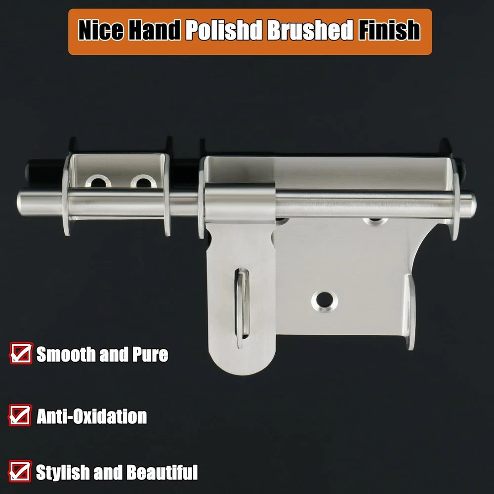 【Premium Quality Material】The bolt latches constructed from hi-q solid stainless steel, ensuring quality and longevity, strong and durable, not easy to rust and oxidation 【Hand Brushed Finished】The padlock latch is finished by hand fine polishing brushed, with smooth and pure surface, retaining the most original beautiful stainless steel color, which can resist daily scratches and corrosion 【Safe and Practical Design】Padlock can be installed with it, very practical and safe design, great security features to Offers Reliable Protection Against Intruders. 【Heavy Duty Design】10mm solid stainless steel latch rod, thickened metal latch body, one-piece molding without welding, heavy duty and strong design, greatly increased safety 【Easy To Install】Installation hardware includes, It just only takes a few minutes to install the gate latches; Applicable to all kind of bathroom doors,Fence Gate, French door, toilet, windows, barns, garage doors, pet doors, inside the door etc Product Description WIDELY USED Applicable To All Kinds of Doors 1 Interior Door 2 Barn 3 Pet Room 4 Fence 5 Front Door More Details About The Bolt Latch 1 2 3 4 5 6 Large Sise/6 Inch Two Sizes Are Available Heavy Duty With A Padlock Safe and Reliable Heavy Duty With A Padlock Safe and Reliable Small Size/4 Inch SET(With A Padlock)