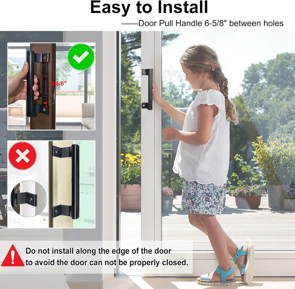 Sliding Door Handle 8" Aluminum Sliding Glass Door Pull - Sliding Patio Door Handles Fits 6-5/8 in Mounting Holes for Old or Damaged Door Pull - Perfect for Patio and Glass Doors (Black) 【High-Quality and Durable】The patio sliding door handle is made of high-quality aluminum alloy material, which is polished and sprayed for long-lasting durability and can withstand daily wear and tear. It can be used as a handle alone or together with a 7/8" wide door lock 【Easy Installation】Our sliding patio door handles comes with installation screws, with a screw installation distance of 6 5/8". Simply drill two holes on the door panel with an appropriately sized drill bit, then tighten the screws with a Phillips screwdriver or drill 【Comfortable Grip】young dance sliding door handle position is designed in an oval shape, which is ergonomically designed to provide customers with a comfortable grip, making it easier and more comfortable to open and close the sliding door 【Wide Applications】The sliding glass door handle is suitable for most decoration styles. Whether your decoration style is modern, minimalist, or elegant, it can add a touch of elegance and fashion to your home. Our handle can be used for various sliding doors, including closet doors, courtyard doors, and shower doors, making it a versatile and practical accessory for any home 【Stylish Design】The slide door handle has a brand-new, ergonomically designed shape that provides comfort and ease of grip for customers, making it easier to move the door. The simple and modern design of the sliding door handle adds a touch of elegance to any sliding door, making it an excellent addition to your home decor