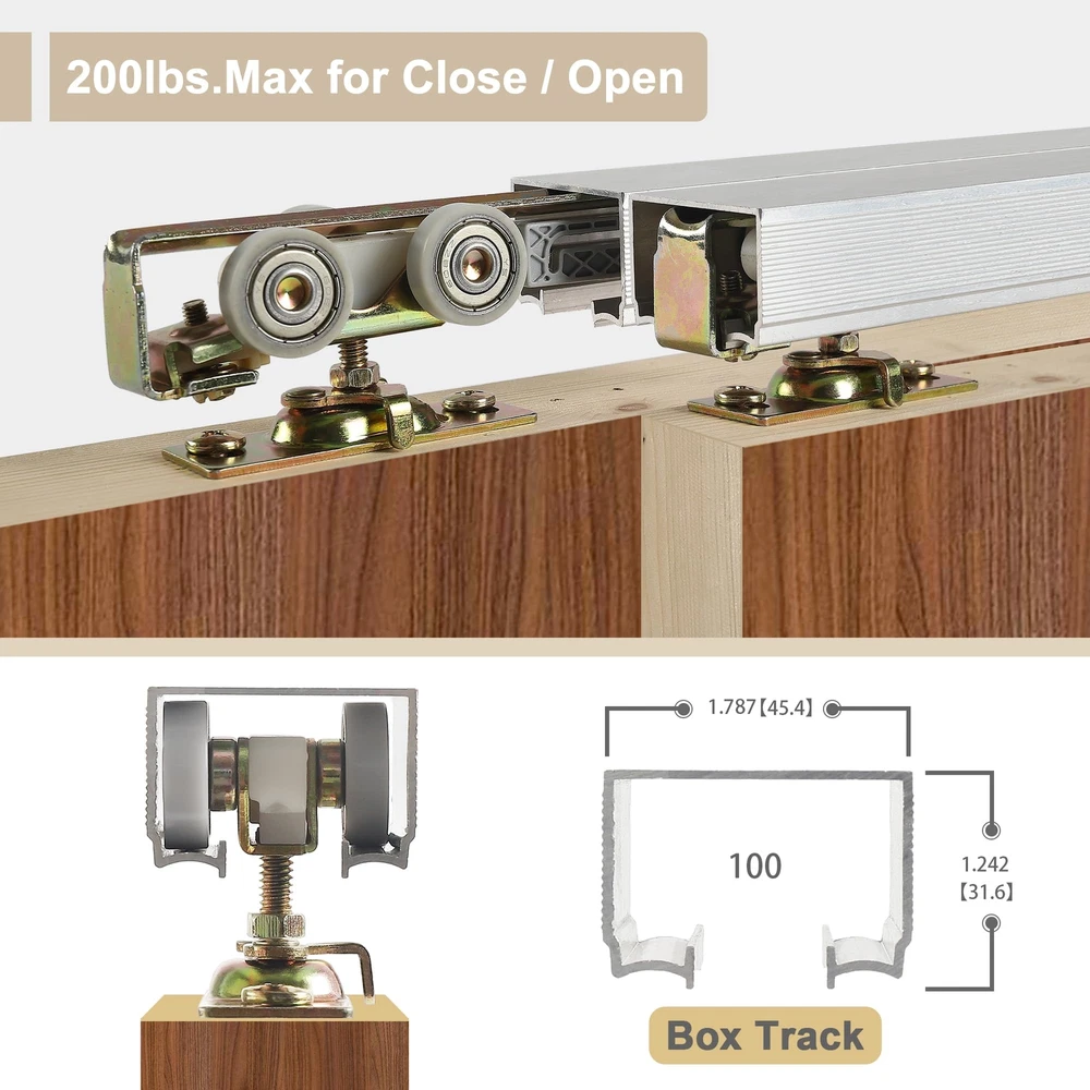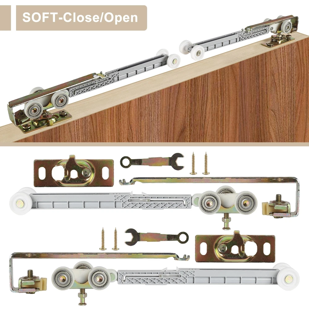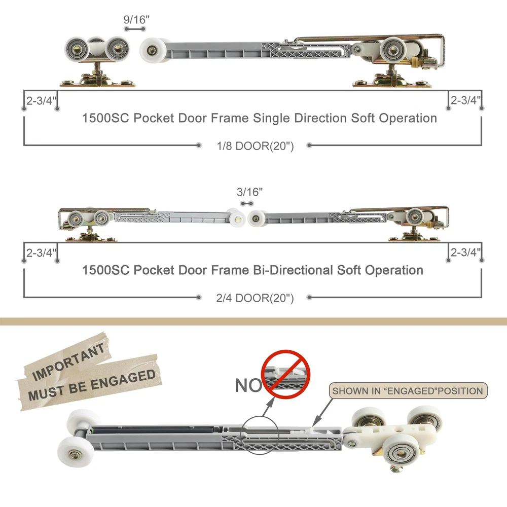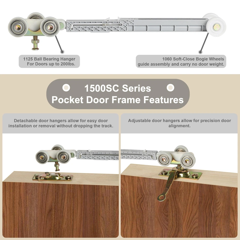 1-inch diameter nylon ball bearing wheels. Perfect for replacing part #1060 hardware kit. For single direction soft close operation, the 1060 must be used in combination with a 1125 door hanger. Compatible with 100, 134F, 138F, 2610F Series Track and 1500, 1560, 1562, 2710 Series pocket door frame. Package Includes: 1 top door hanger with soft closer assembly, 1 track metal bracket, 1 door stop, 1 wrench and 1 screw pack.