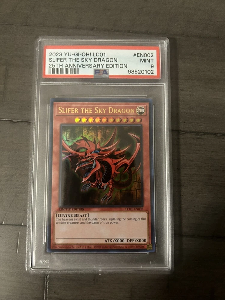 brand:KonamiDefense/Toughness:0Additional Description:Slifer the Sky Dragon (25th Anniversary Edition)Card Text:The heavens twist and thunder roars, signaling the coming of this ancient creature, and the dawn of true power.Manufacturer:KonamiCreature/Monster Type:Divine-BeastFeatures:Limited EditionAttack/Power:0Language:EnglishLevel:10Rarity:Ultra RareAttribute/MTG:Color:DivineCard Name:Slifer The Sky DragonGame:Yu-Gi-Oh! TCGCard Type:EffectCard Number:LC01-EN002Set:Legendary Collection: 25th Anniversary Edition