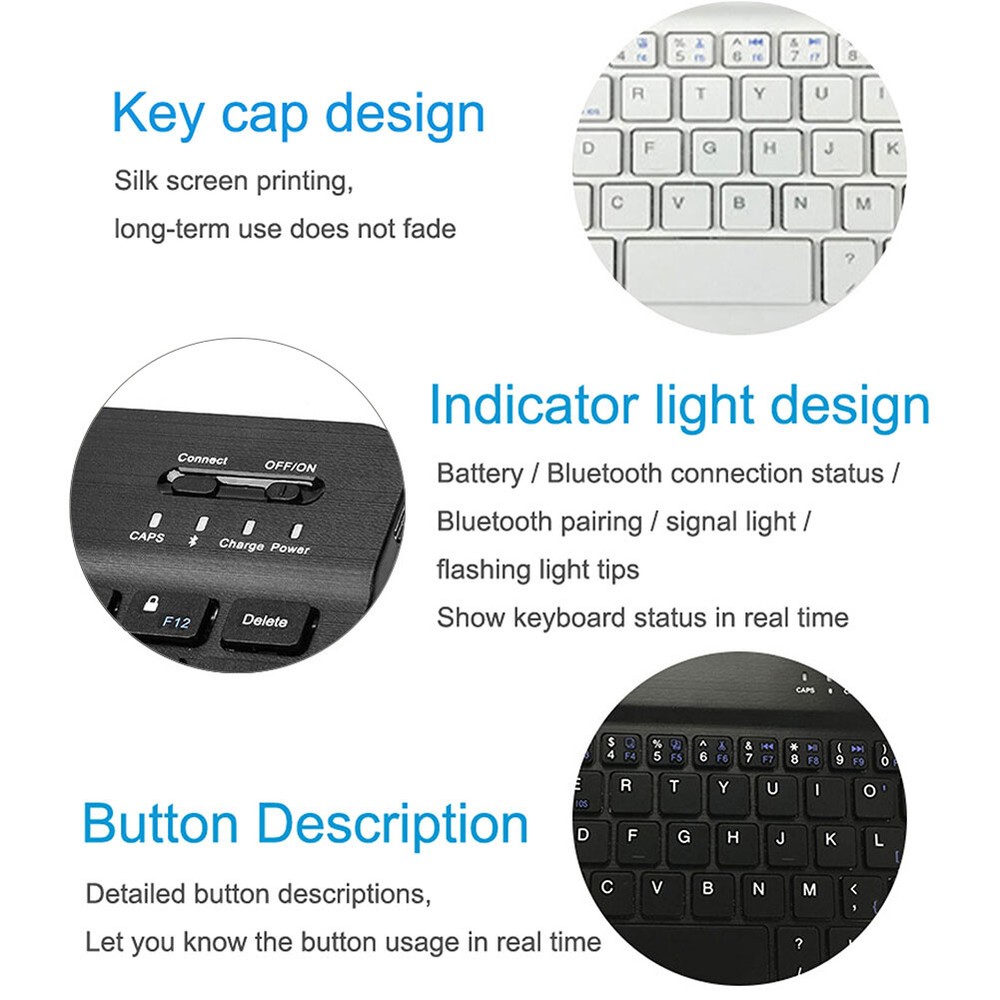 Product Description Features: --Bluetooth technology provides a cable-free & clutter-free connection. -- Compatible with the iPad and all Bluetooth-enabled tablets, laptops, and computers. --Ultra Slim, sleek profile (0.23in thin) easily stows in a backpack, messenger bag, or case. -- Standard keyboard without any wrong code and keys. --A high quality wireless bluetooth keyboard designed for smart phones and tablet PC. --Floating chocolate keyboard structure promises a silenced operation of the keyboard. --Built-in 200mAh Rechargeable Battery. --The keyboard adopts stable Bluetooth 3.0 technology, the working distance is up to 10m Specification: Material: ABS Plastic size :24.6X14.8X0.6cm(9.68x5.82x0.23in) Standard Bluetooth 3.0 Effective distance 10 meters Standby time: 100 days Continuous working time: 70 hours Charging time: 4-5 hours Lithium battery capacity: 200mAh Lithium battery life: 3 years Button life: 5 million times Working temperature; minus 10 degrees to 55 degrees Compatible with Apple iPad Air, iPad mini with Retina Display, iPad 2, iPad 3, iPad 4, iPad mini; iPhone 4 & 4S, iPhone 5; iPod Touch. Bluetooth-enabled PCs or Laptops with Windows XP/Vista/7/8. Bluetooth-enabled iMac / Macbooks with Mac OS X 10.2.8 or above. Smartphones or tablets with Android 3.0 and above. Windows Mobile 5.0 and above. Not compatible Mac mini. Package Include: 1* Wireless Keyboard 1* USB Charging Cable 1* Instruction Manual