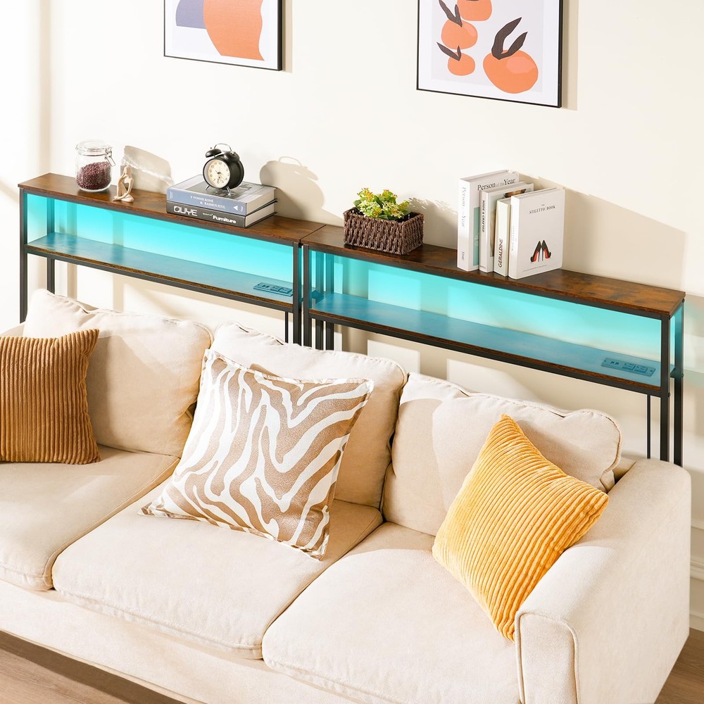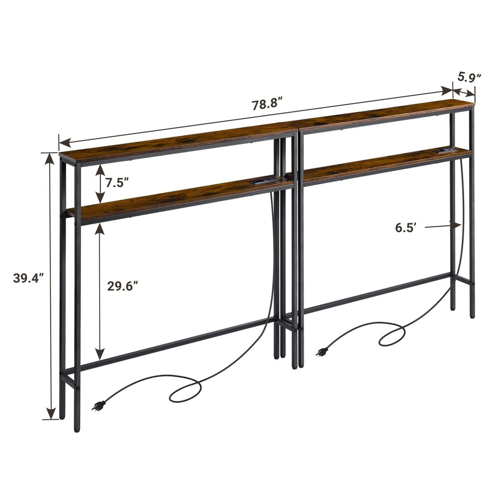 Sometimes the sofa will block the socket on the original wall, resulting in a waste of resources. This hallway table is designed to serve both commercial/home decoration and functionality purposes. With the size of 39.4"L x 5.9"W x 39.4"H, works greatly as a console table, plant stand end table, lamp table or entry table. Appropriate size makes this console table perfect for living room, dining room, study, balcony, office, hallways and so on. Sightly simple design and low-key industrial style can perfectly match any decoration style. Smart Solution for Utilizing Space Behind Sofa: Measuring 5.9" Dx39.4”Wx39.4”H, this sleek design effortlessly fits into narrow gaps between your sofa and the wall, leaving ample room for wall vents, moreover, its integrated 2-tier shelf provides convenient storage space for showcasing your cherished items in the living room Sofa Table with Built-in Outlets: Equipped with 2 standard 120VAC outlets and 2 USB ports on each side, along with a 6.5’ long power cord, this console table is designed to rescue you from the inconvenience of an inaccessible outlet behind your sofa, and then you can effortlessly power up your phone, tablet, headphones, and more—all within arm's reach, allowing you to fully indulge in your leisure time on the sofa Customizable LED Illumination: Elevate your ambiance with our adjustable LED light strip. Simply connect it to the USB port, and immerse yourself in a spectrum of 15 dimmable color options and 4 dynamic modes, all controlled via remote, tailor the lighting to suit your mood or occasion, transforming your living room into a captivating and dynamic space that reflects your style Timeless Fusion of Styles: Blending retro charm with modern flair, our design effortlessly marries rustic brown boards with sturdy metal tubes, a timeless aesthetic that exudes sophistication and warmth; complemented by vibrant LED lighting, this fusion of styles creates an inviting and versatile environment that perfectly reflects your unique taste and personality Quick and Hassle-Free Installation: Assembling the narrow sofa table is a breeze, requiring no additional tools, the provided screws and tools guide you through the installation process, delivering a sturdy and reliable table in just a few minutes