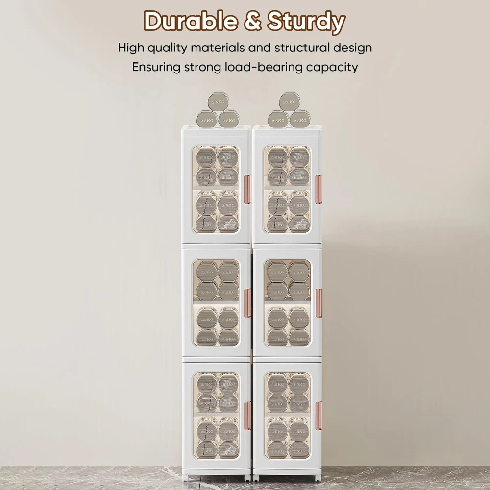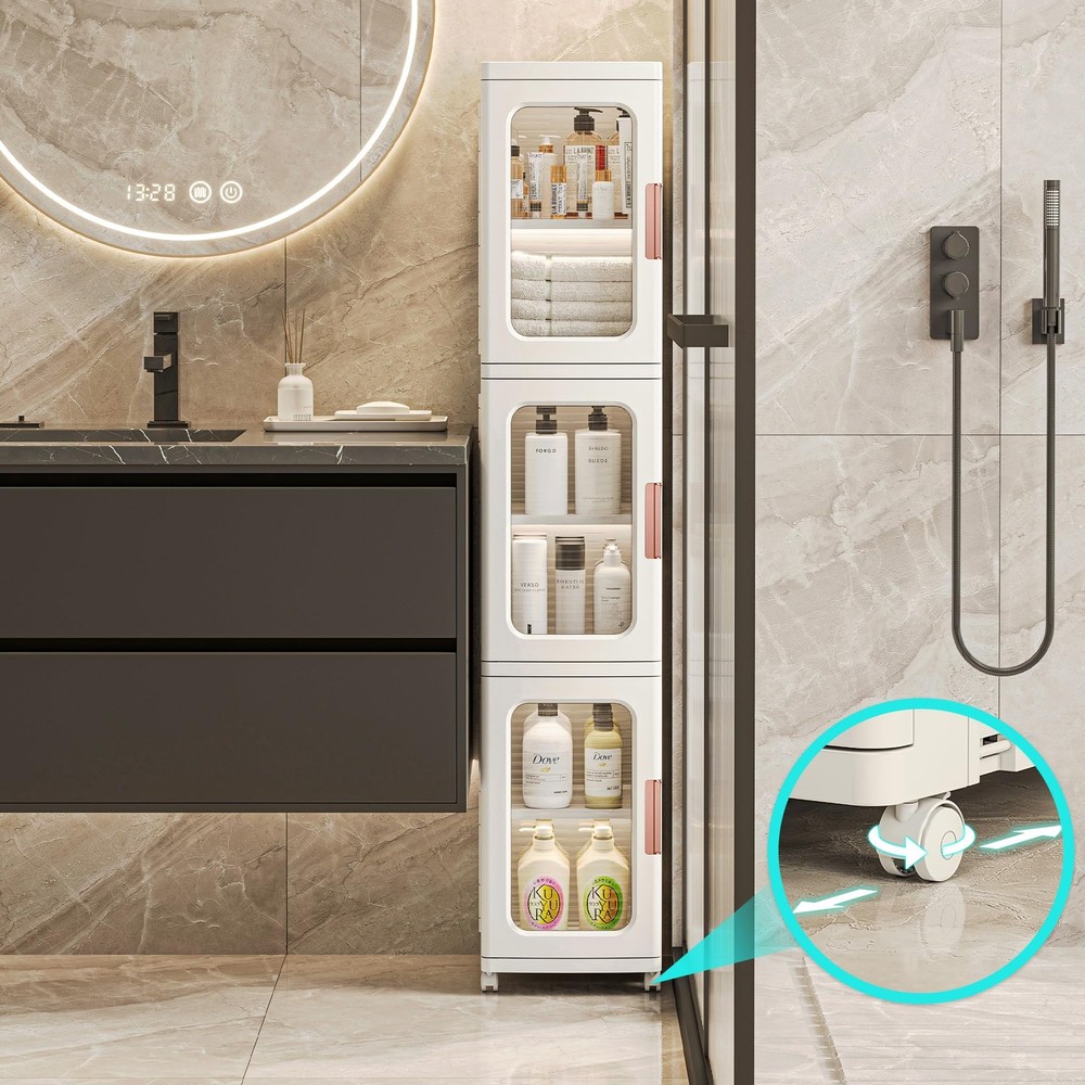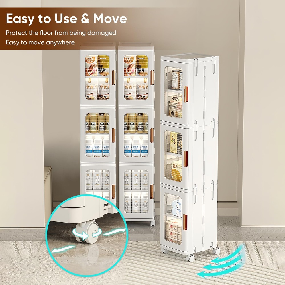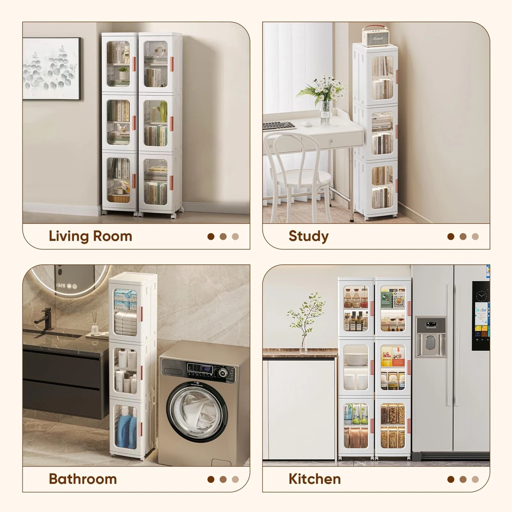 slim kitchen pantry storage cabinet with doors and shelves is designed for storing a various of items in the bathroom, kitchen, pantry, living room, bedroom, laundry room, and other space. Features adjustable shelves with 3 different heights to meet your storage needs. This kitchen pantry storage cabinet is made of ABS & PP materials; Fasten buckle on both sides, keep the cabinet structure more stable and reliable; Strong load-bearing capacity, no tilting or deformation. Magnetic enclosed doors provides good sealing performance, waterproof; Easy to open; Easy to clean; Large storage space to store daily necessities easily, help to keep your living space organized. The narrow bathroom storage with compact design which easily fit into corners or narrow spaces; Doesn't take up much floor space, space saving. Easy Asembly & Easy to Use: Easy to assemble with no installation tools required; Easy to move, protecting the floor from scratches Multi-purpose Stackable Storage Cabinet: Elegant in appearance, slim kitchen pantry storage cabinets with doors and shelves can be adapted to various style of house; Ideal for storing a various of items in the bathroom, kitchen, pantry, living room, bedroom and other space; Features 3 adjustable shelves with 3 heights options to meet your storage needs, keep your home neat and organized Sturdy & Safe: This narrow storage cabinet is made of ABS & PP materials; Fasten buckle on both sides that keep the pantry cabinet structure more stable; Strong load-bearing capacity, remains stable without tilting or deforming when fully loaded; The sleek curved edge design to reduce the risk of bumps and injuries for children or the elderly Waterproof & Easy to Clean: The kitchen storage cabinet with magnetic enclosed doors provides good sealing performance, waterproof; Smooth & flat surface that can be cleaned with just a wet rag for easy maintenance Large Capacity & Space Saving: With 2-tiers stacked dimensions of 11.2" x 9.65" x 33.86" (height included wheels); Provide large storage space to store daily necessities easily, keep your belongings organized and your living space tidy; The slim storage cabinet with compact design that fits nicely into corners or narrow spaces; This slim bathroom storage has a small cross-section and doesn't take up much floor space, space saving and improve space utilisation Easy Asembly & Easy to Use: Easy to assemble, no installation tools required to complete the freestanding cabinet assembly; Visual cabinet doors allow you to easily see where items are located, saving you time in reaching for them; The universal wheels allow you to move easily, protecting the floor from scratches