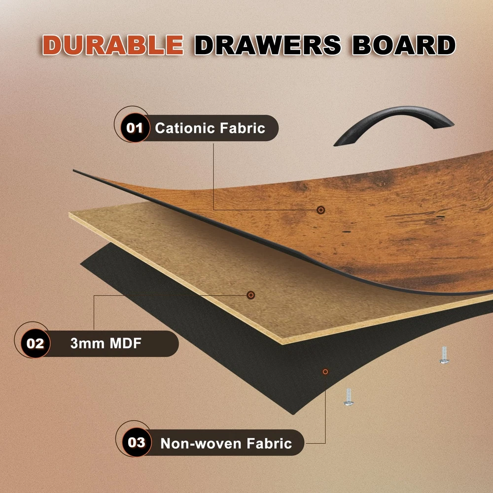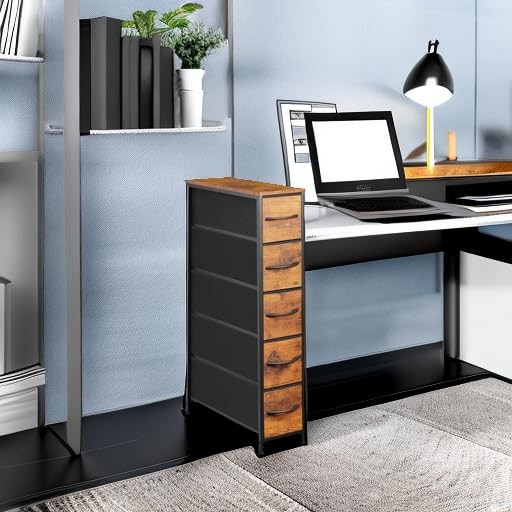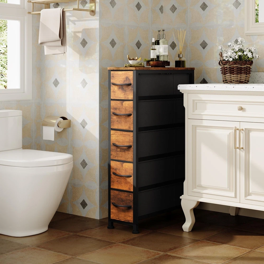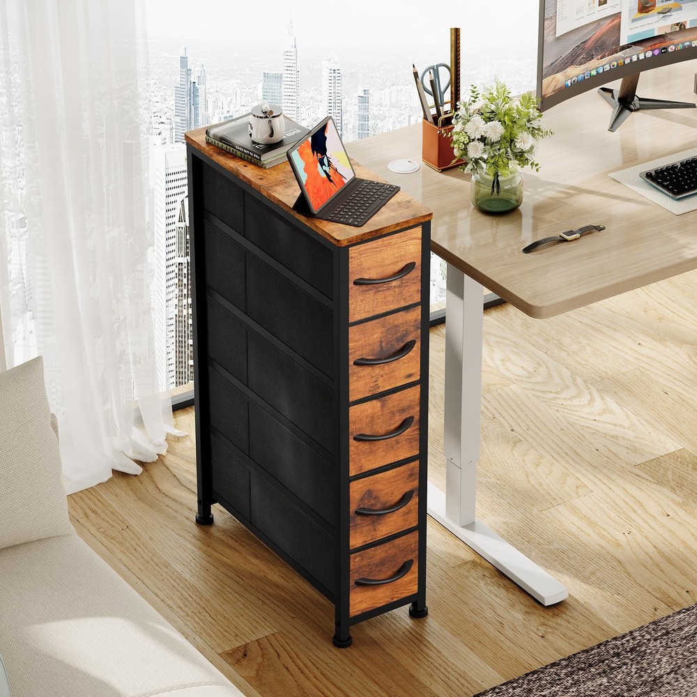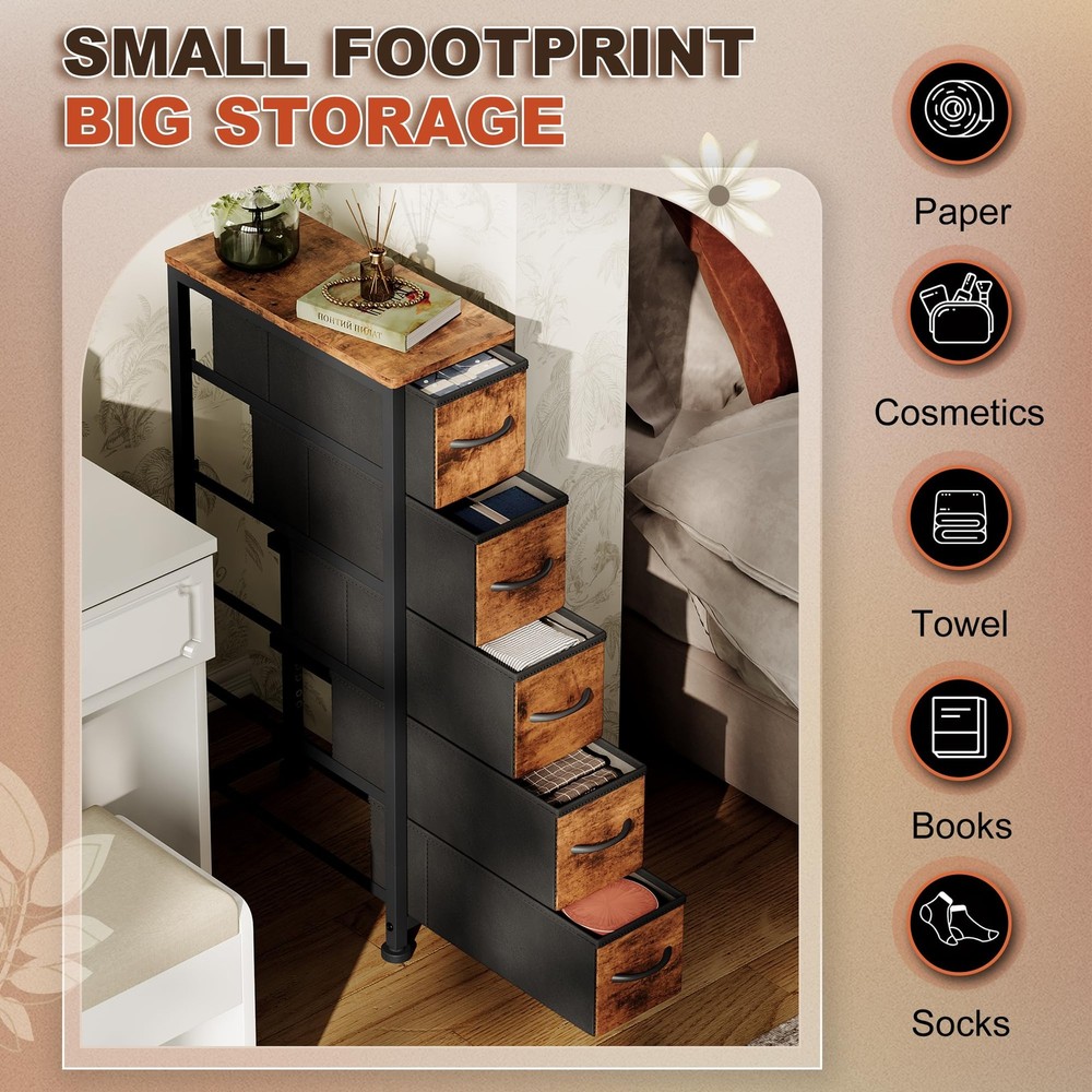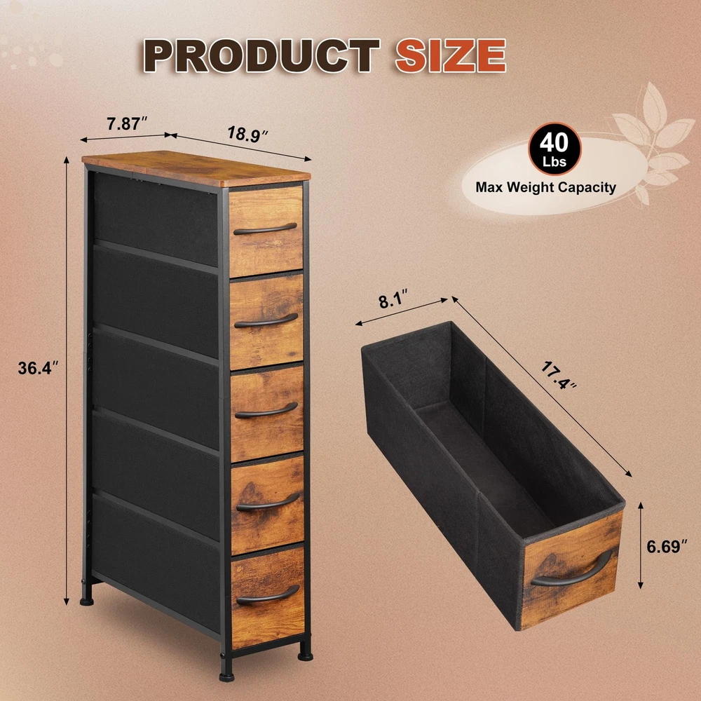 Narrow Dresser Storage Tower with 5 Drawers, Slim Dresser Chest of Drawers with Steel Frame, Wood Top, Dresser for Bedroom, Bathroom, Small Spaces, Laundry, Closet, Rustic Brown Versatile Storage Solution: Narrow storage drawers fits in many locations organize your home and keep drawer organizer. As a small dresser with slim drawers in laundry room, or placed inside the closet to create extra storage. Ideal for use in bedrooms, nurseries, bathroom and living room. Ample Space: With 5 foldable fabric dresser drawers, each drawer can hold up to 10 lbs. Store all your articles for daily use. The spacious wooden top is perfect for keeping everyday essentials like lights, books, decorations, etc. within reach. Durable Material: Non-woven fabric drawer is breathable and can be wiped directly with a wet cloth; Solid MDF board with water-resistant design also easy to clean. Easy-to-pull plastic handle can smoothly open and close the drawer. Sturdy Structure: The tall skinny dresser anti-tipping accessories can protect you from any hurt. High-quality sturdy steel frame can provide stable support. Adjustable Feet: 4 adjustable feet with plastic cover can protect your floor and are also suitable for uneven ground. This narrow storage cabinet can fix or move around your home office freely. Unique fabric drawer design makes it light to move. Easy Assemble: The dresser measures 18.9''D x 7.9''W x 36.4''H. Clear manual, all screws, and tools are offered in the package. You can set up the whole drawer dresser easily by following the manual, and the uploaded assembly video is also for guidance. For any further support, please contact us.