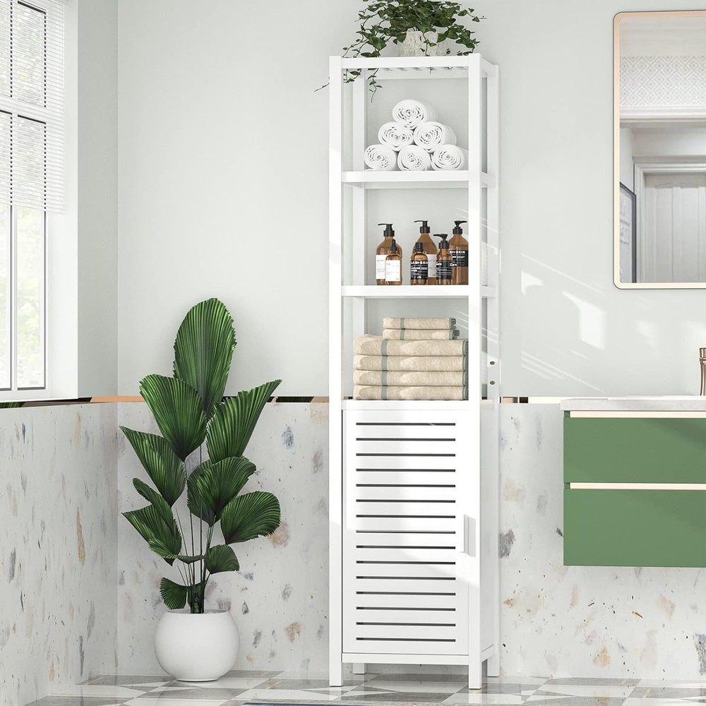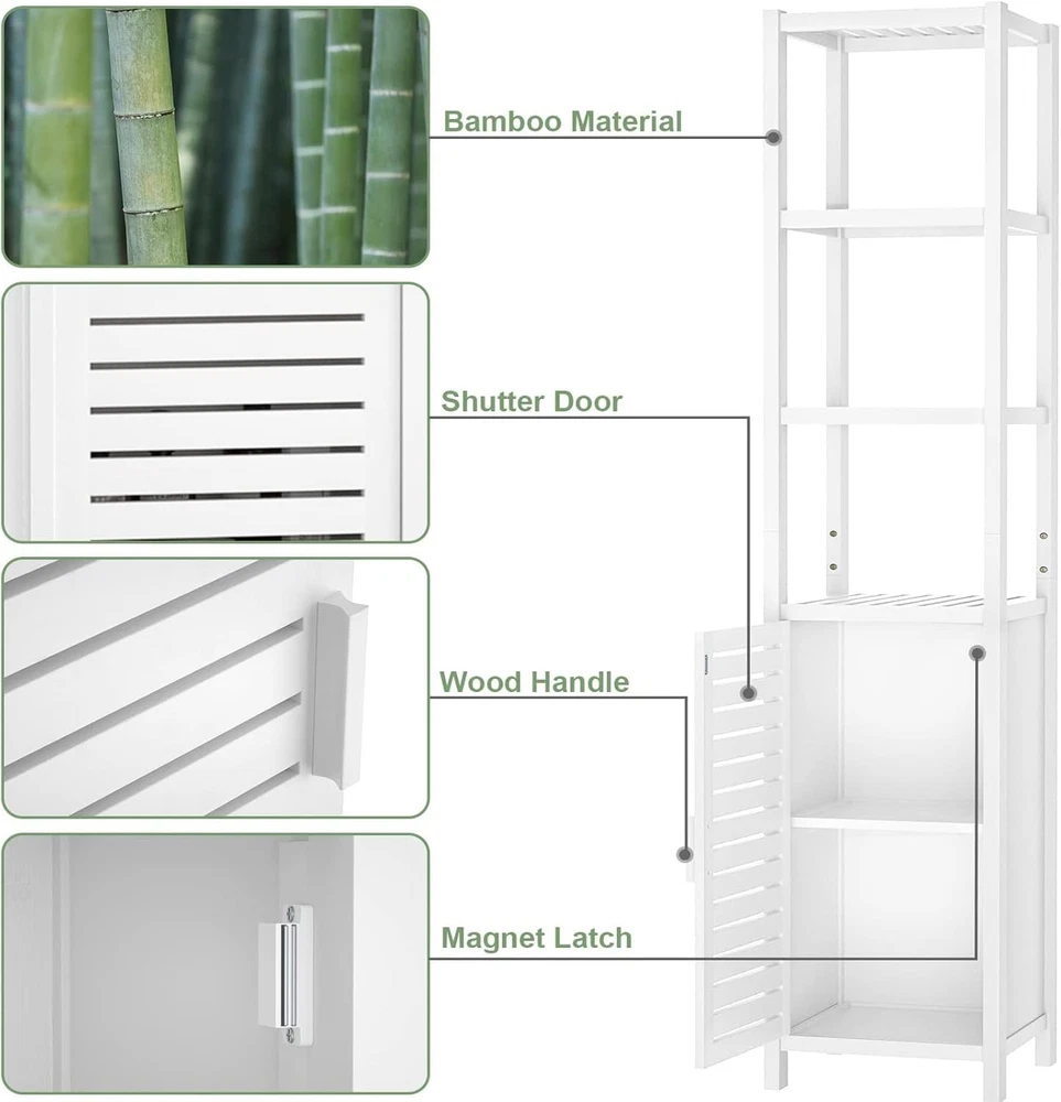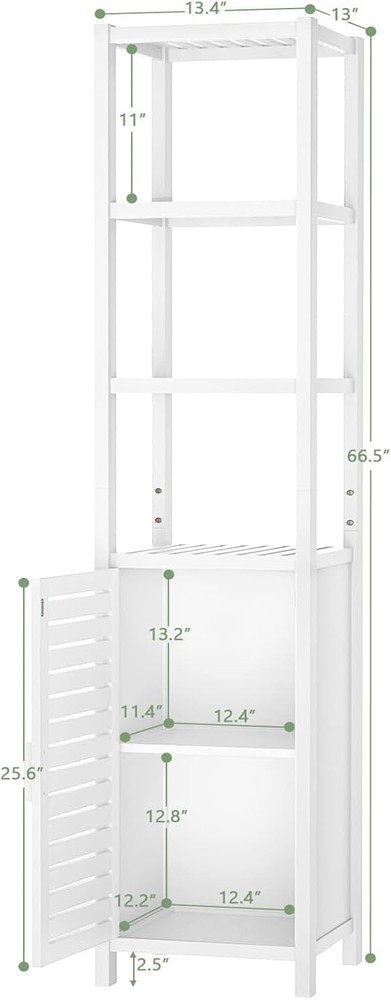 Product Description About this item TALL NARROW BATHROOM CABINET - Don't waste the corner space of your bathroom. Look at this compact bathroom cabinet with dimensions of 13.4” L x 13” D x 66.5” H, it's a great option for narrow nooks and cramped corners in your bathroom and keeps your daily essentials within easy reach. NATURAL BAMBOO STORAGE CABINET - White slim cabinet is made of sustainable bamboo for clean green living, the shutter door and slatted shelves add style and charm to this storage cabinet. You can easily hide the spare toiletries, toilet paper, and hairdryer behind the door, display your favorite diffuser, atmosphere candles, and plush towels on the shelves. FUNCTIONAL STORAGE CABINET - Simple design and classic white finish, it can be well integrated into your living room, kitchen, hallway, study room as a free standing side cabinet, it can meet your different needs. LARGE STORAGE SPACE - This floor standing cabinet sports 4 open shelves, as well as 2 interior shelves behind the door, providing ample storage space for you to keep everything in order. Load capacity of each layer: 22 lbs. EXCELLENT STABILITY - Stable construction, no wobbling, comes with the anti-tipping kit, ensure long-lasting use. The quality materials used along with an elegant appeal will adorn any decor for many years. WORRY FREE ASSEMBLY - The assembly is easy with the provided step-by-step instructions and hardware pack. Wipe clean with a clean damped cloth. Avoid using harsh chemicals. 6-Tier Tall Bamboo Bathroom Storage Cabinet Free Standing Narrow Tower Organizer for Living Room, Kitchen, Bedroom It's all too easy to run out of space for storage in a master bath or powder room. With a tall cabinet like this, you add a handy spot to tuck away all the clutter. Help you classify your items better, you can put a variety of toiletries, cosmetics, and other sundries. White free-standing bathroom cabinet is perfect for your modern or traditional decor. You can also put this cabinet as a corner cabinet in the living room, bedroom, or kitchen, and various household items can be stored in one cabinet. Superior Material: Crafted from natural bamboo with a white finish. Large Storage Space: 2 interior shelves and 4 open shelves provide plenty of space for storage. Sturdy and Safe: Stable construction, no wobbling, comes with the anti-tipping kit, long-lasting use. Shutter Door: You can put unopened toiletries and skin care products behind the door. Easy to Assembly: Includes step-by-step instructions to make installation quick and easy. Product Dimensions: 13.11 x 13.39 x 66.54 inches, height between shelves is: 11”, height between interior shelves is: 12.8”/13.2” Shelf Weight Capacity: 132 pounds (6 layers) NOTE: The maximum static load capacity of each layer is 22 lb, please do not exceed this limit. Children are not allowed to climb on the product or play with it. For safety reasons, please secure the product to the wall with the included anti-tip kit. Avoid letting liquids stay on the product for long periods of time.