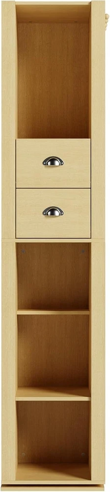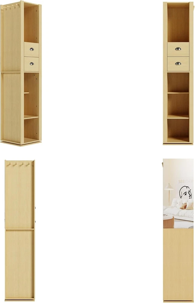 Product Description About this item Multi-functional Cabinet: This light-wood-finished bathroom storage cabinet boasts a tall, narrow vertical design and a 360-degree swivel function. The natural tone radiates warmth and simplicity, and its vertically-stretched, tall form suits small spaces. It integrates mirror, clothing-hanging, magazine-organizing, and storage functions, being both practical and good-looking Ample Storage Space: This cabinet measures 13.8"L x 13.8"W x 64.8"H. 2 drawers (ideal for personal items such as cosmetics) provide closed storage; 4 open shelves for towels and toiletries; 4 hanging rods for hanging bath towels or clothes; 4 magazine organizers for magazines, photo albums. Keep your items reasonably placed Sturdy Construction: This thin cabinet is made of high-quality PB board, which is durable and sturdy. The drawers are equipped with metal handles, enhancing the texture. The wooden hanging rods can bear more weight, making it convenient to hang various items Versatile: This skinny cabinet has a compact design, making it suitable for use in bathrooms and entryways. Its multi-tiered open design offers ample storage space for towels and bathroom essentials. The mirror on the side of the cabinet allows for quick grooming before heading out Simple to Assemble: Each assembly part of the narrow bathroom storage cabinet is numbered accordingly, just follow the instructions step by step to get a storage cabinet with modern design Tall Bathroom Cabinet Modern, Robust, Practical This multi-functional organizer with simple and practical design is suitable for bathrooms and entryways, making your home life more tidy and organized. Metal Handles Magazine Organizers Hanging Rods Open Shelves Tall Bathroom Cabinet Color Natural Overall Dimensions 13.8"D x 13.8"W x 64.8"H Material PB Package Includes Tall Bathroom Cabine tX 1; Stool X 1; Instruction X 1 On Aug 15, 2025 at 01:10:30 PDT, seller added the following information: