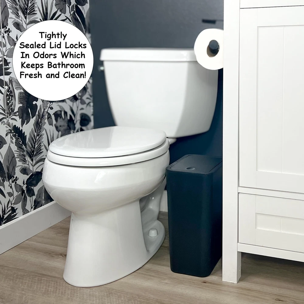 The Best Small Trash Can Ever get tired of trash bags repeatedly falling into a trash can, and constantly having to re-adjust them? We are too! We didn't see a single trash can that held bags fixed in place, so we made one. Enjoy the convenience of a trash can where you don't have to worry about bags falling in! Anti - Bag Slip Clips - Simply clip bags into the inside of the trash can, and they will never fall in. And you get the added bonus that the bag doesn't need to be tucked around the top of the can, meaning that it won't be visible at all when the can is closed. Your trash can will look cleaner than ever! Works With Any Bag - The clips fit with almost any bag you think of to securely hold it in place. This saves you tons of money because you don't have to buy special fitted bags for your trash can anymore! Any bag will do! Pop Up Lid - Use the trash can peacefully with no noise when it opens and closes with a simple press! The pop up lid securely seals the trash can and keeps odors in. Easy to Clean - Made with high quality ABS materials, the trash can is simple and easy to clean. Wipe it down with no hassle. Quality Construction - Make use of the durable steel clips and pop up lid for repeated uses without any problems. A great size of 13" H x 8.8" L x 6.2" W for the trash can makes it great for small spaces. PATENT PENDING βœ… 𝗣𝗒𝗣 𝗨𝗣 π—Ÿπ—œπ—— - The lid opens simply and quietly by pressing it open and closed. It traps smells inside with a secure and strong seal, making it ideal around pets and bathrooms. βœ… π—”π—‘π—§π—œ π—•π—”π—š π—¦π—Ÿπ—œπ—£ π—–π—Ÿπ—œπ—£π—¦ - No more having to keep fixing your bag because it has fallen into the trash can. Or have it exposed on the outside. Bags never fall into tiny bin, touch-less design, great for any room, office. βœ… π—ͺ𝗒π—₯π—žπ—¦ π—ͺπ—œπ—§π—› 𝗔𝗑𝗬 π—•π—”π—š - Save more than $15 on not having to buy custom liner bags to fit your trash can. Use any old cheap bag lying around. Any bag snugly fits the bin and stays hidden inside. βœ… π—˜π—”π—¦π—¬ 𝗧𝗒 π—–π—Ÿπ—˜π—”π—‘ - has ensured this trash can will take no time to clean. Made from high-quality, 100% recyclable ABS materials, best mini dustbin or wastebasket. βœ… π—¦π— π—”π—Ÿπ—Ÿ 𝗕𝗔𝗧𝗛π—₯𝗒𝗒𝗠 𝗧π—₯𝗔𝗦𝗛 𝗖𝗔𝗑 - Built with durability in mind, this trash can will last you for years. All of the material used a premium grade. Durable lid and construction, 13" H x 8.8" L x 6.2" W size, slim and skinny