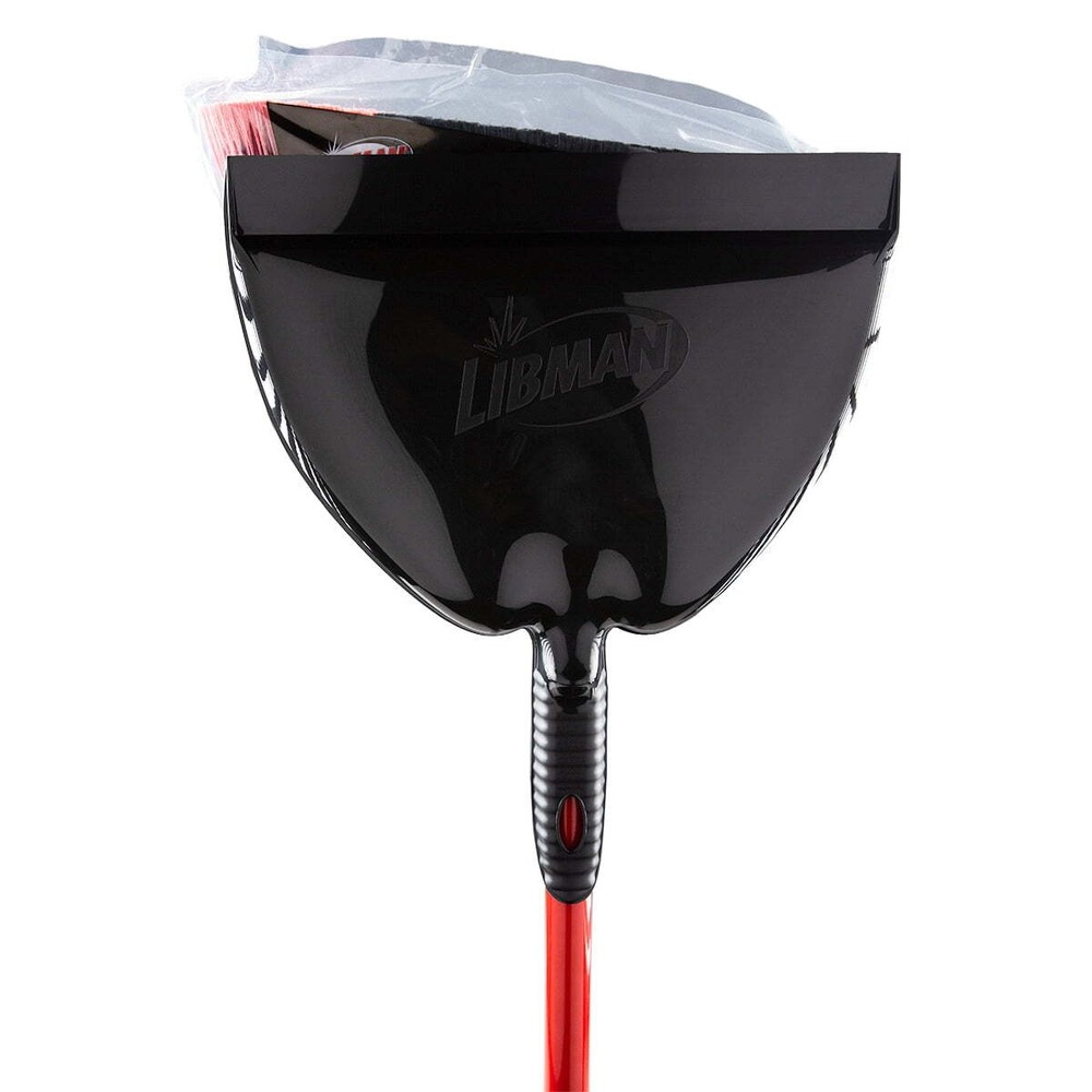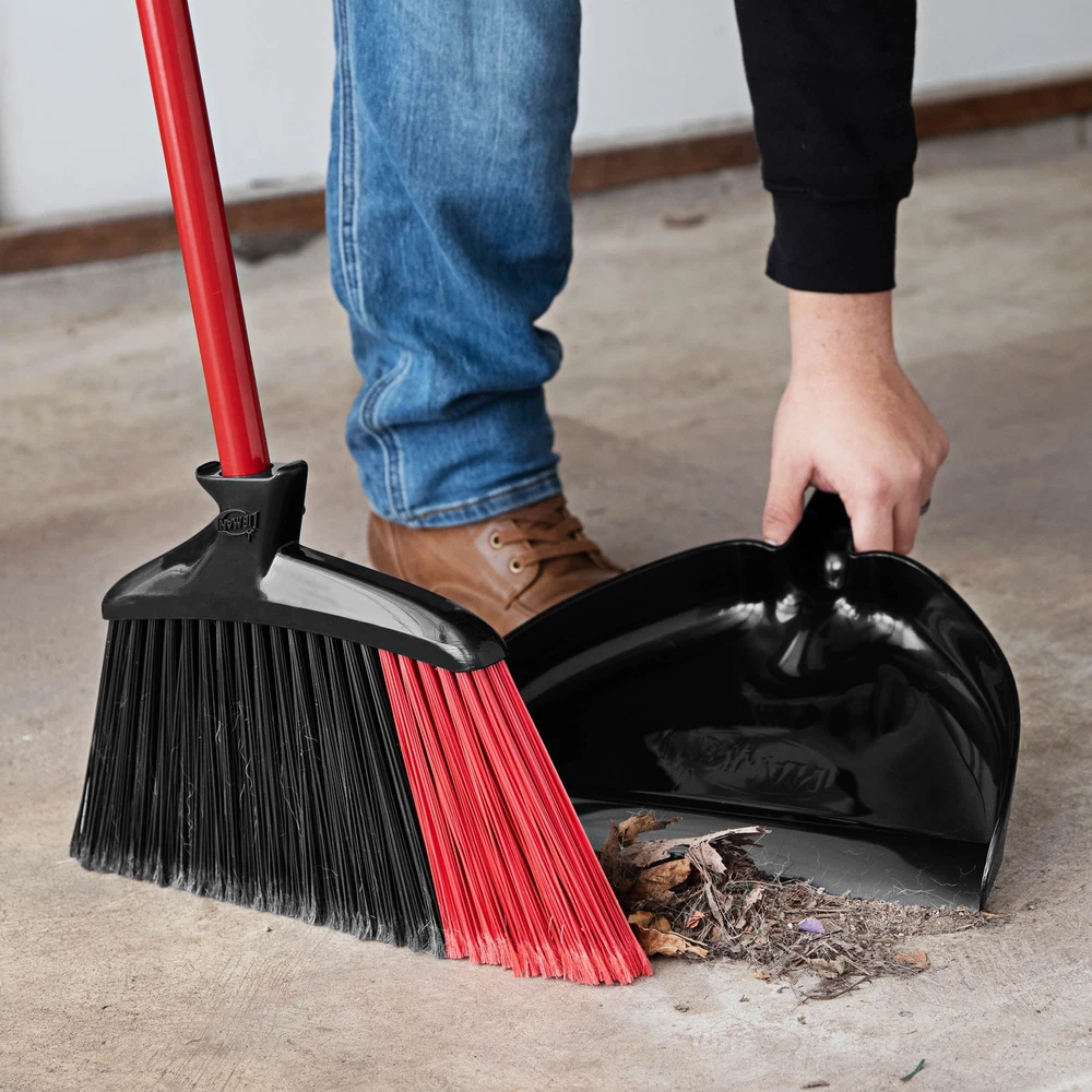 The Libman High Power 905 Indoor and Outdoor Angle Broom with Dust Pan with steel handle. Angled head fibers that are precisely cut to reach under cabinets and into tight corners. The two contrasting black and red color bands of recycled pet bottles are 5.5” long to provide great sweeping action. Long-life environmentally friendly Pet bristles are strong enough for outdoor use and can also be used indoors due to the non-scratch PET broom fibers. Electrostatic powder-coated steel handle with LLDPE molded hanger provides superior rust and corrosion protection. The steel handle threads into the polypropylene molded broom block for a firm, sturdy connection. The heavy-duty black polypropylene has a smooth edge that allows a good seal to floor surfaces to allow the user to capture all surface debris into the dustpan, and the dustpan snaps onto the handle for easy storage. Steel powder coated handle. Libman Multi surface broom fibbers clean any surface such as concrete, brick, wood, stone, and more Excellent for commercial and residential uses Dust pan attaches to broom handle for easy storage 5.5 inch Broom fibers are precisely cut to reach under cabinets and tight corners Powder coated steel handle resist rust providing years of service and includes built in hanger hole for easier storage. Solid Polypropylene molded broom block and dust pan engineered for years of hard use Steel powder coated handle