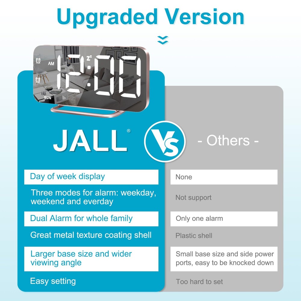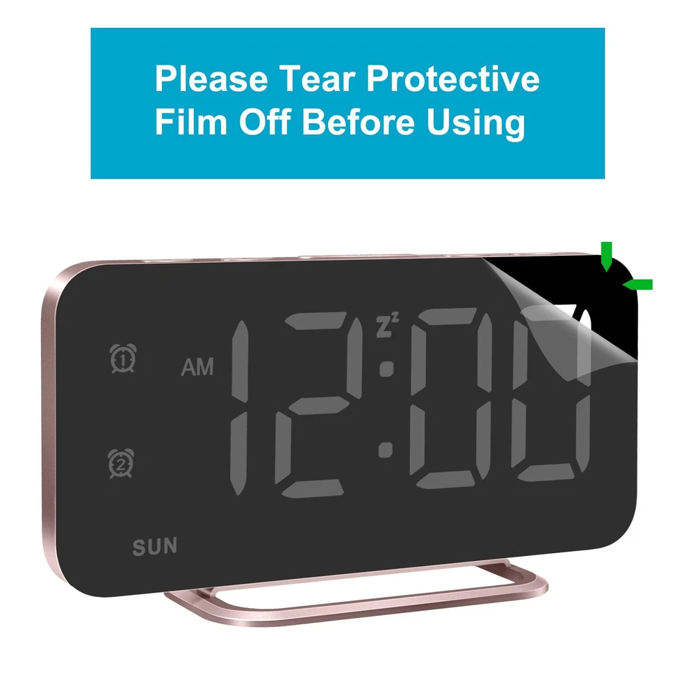 Super Slim LED Digital Alarm Clock, Mirror Surface for Makeup, with Diming Mode, 4 Levels Brightness, Large Display, Easy Setting, Dual USB Ports, Modern Decoration for Home, Bedroom Decor(RoseGold) 【Size and Design】About 6.7 inches (L 6.4 inches * W 3 inches) HD mirror screen display allows you to use it as a mirror to groom your looks while viewing the time. The alarm clock body has been redesigned to reduce its thickness to only 0.4 inches. Its sleek and simple design makes it both practical as an alarm clock and fashionable as a decoration. 【Easy Setting and Using】With just five buttons, you can easily set up the clock. A detailed user manual is also included. The alarm clock has an approximate 95-degree angle of elevation, making it difficult to be knocked over. At the same time, it also increases the viewing angle and its large digital display makes it easier to see the time. 【Brightness Setting】There are total 4 levels of brightness for you to choose from, namely, bright (L3), natural (L2), dark (L1), and completely off (L0). This allows you to use the alarm clock comfortably in different lighting environments and different usage scenarios. 【Alarm Setting】Two independent alarms can be set up with different work modes, 1-7 (MON-SUN), 1-5 (MON-FRI), 6-7 (SAT-SUN), to meet the needs of the whole family. And there are 5 levels of alarm volume for you to select. Snooze button can get you an extra nine minutes of sleep. 【USB Charge Ports】The alarm clock provides two independent USB ports, allowing you to charge your devices. This eliminates the hassle of having to use a lot of power adapters. All in all, it's an alarm clock suitable for everyone. 【Perfect Gift for Women】This mirror alarm clock is a perfect gift for women, sister, teen girl, daughter, mom. And its elegant appearance and practical function make it a thoughtful holiday gift. There are also multiple colors to choose from, meeting everyone's preferences.