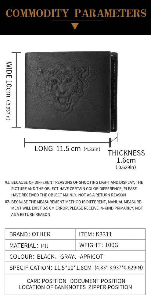 Free and fast shipping , shipping take up 1-7 Business Days 30 Day Return Accepted EASY PAYMENT via PayPal, Credit Card, PayPal Credit, Google Pay... Wallet Credit Card Holder Tiger Leather Multicolor Modern Solid Man Small Slim Specifications: Material: pu material Pattern type: 3D relief tiger pattern Size: 11.5*1.6*10cm Weight: 0.1kg Color: Black, gray, apricot Attention: 1. Due to the different display colors of different computers, the actual color of the item may be slightly different from the picture, please understand. 2. Size: Please allow 0-2cm difference, due to manual measurement slightly error. REVIEWS The product came very well packaged. I'm very happy. thank you for everything. Seller strongly recommended. This is great! I definitely recommend! Product looks amazing Delivery was fast. Excellent seller, great communication. I advise everyone to buy it!