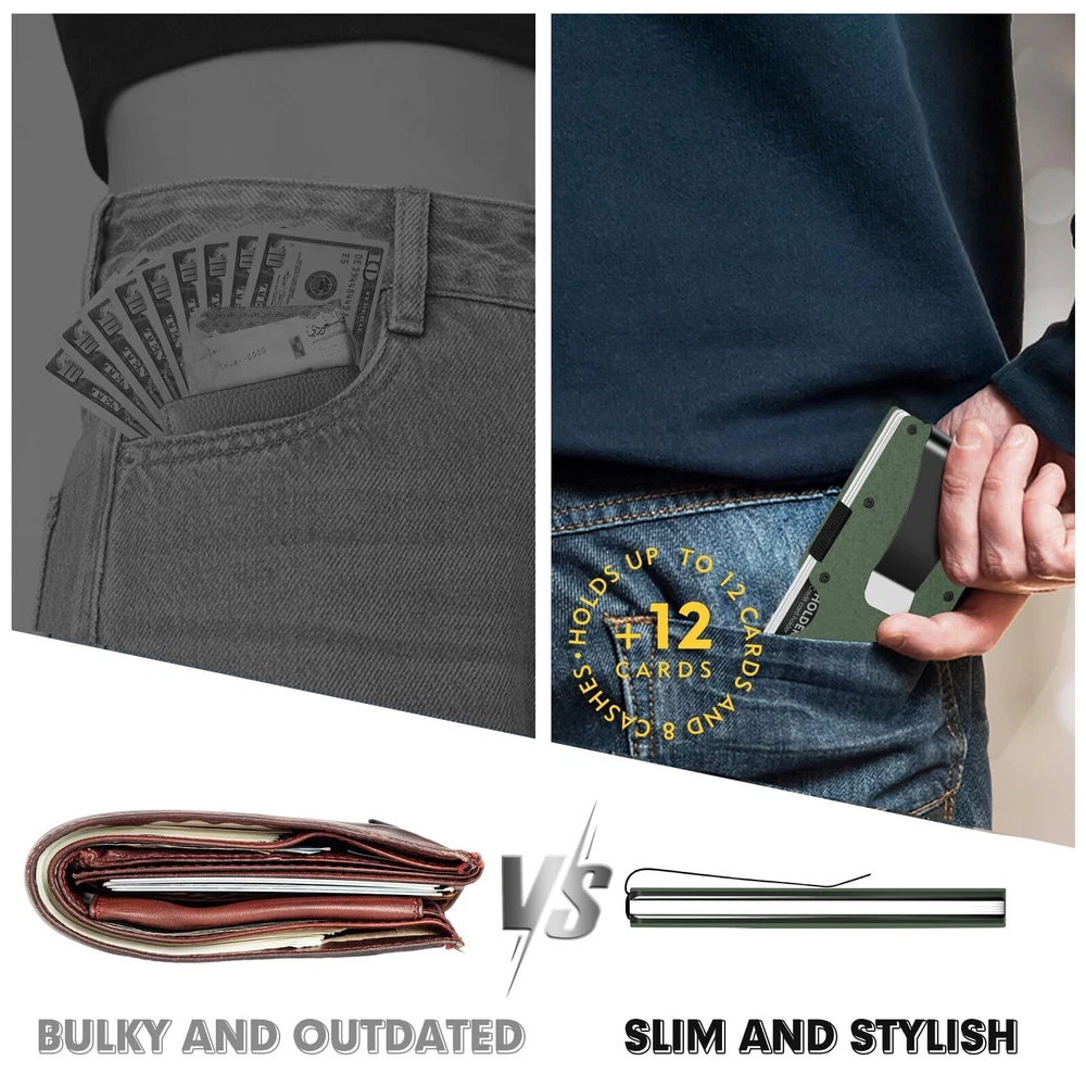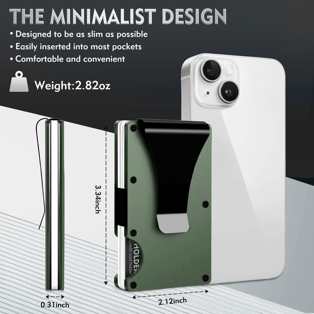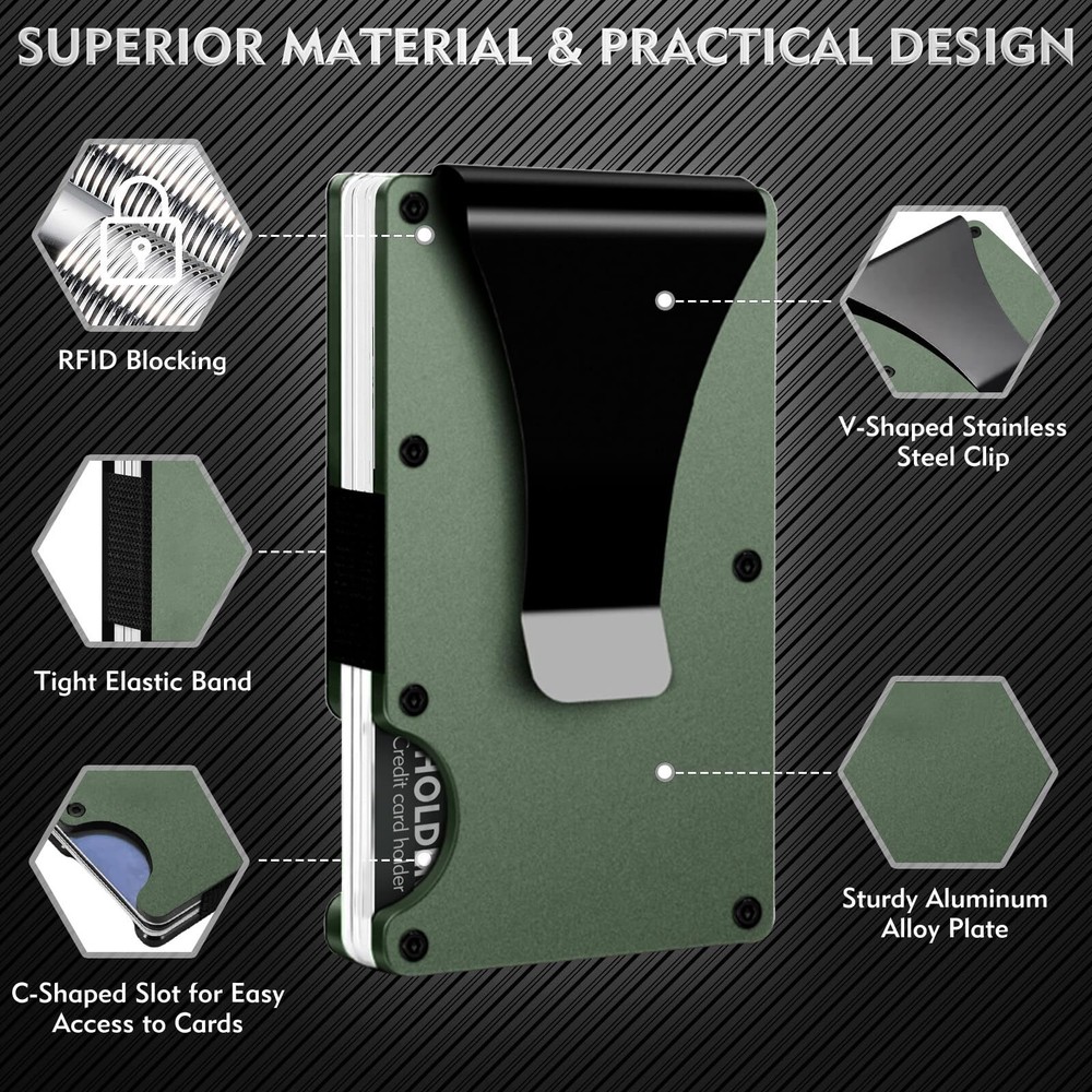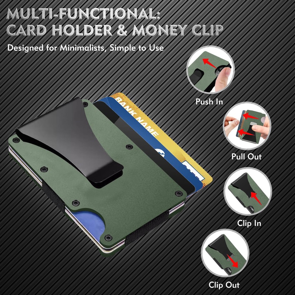 【Minimalist Design】This mens minimalist wallet features an ultra-thin, ergonomic and lightweight design, giving you a slim and comfortable feel. It can be easily tucked into almost any pocket and can even hold up to 12 cards and 8 cash without feeling bulky. It's time to ditch your bulky wallet forever. 【Information Security】Our men's metal wallet has been upgraded with in-built RFID blocking technology to effectively prevent thieves from scanning and accessing your cards in your wallet, ensuring the security of your personal and financial information at any time. 【Superior Material】The credit card wallet for men is crafted from premium aluminium and stainless steel material with rustproof process for the surface to resist rust, fading and scratching, built-in high-stretch elasticated band is durable and easy for you to access your cards. 【Functionality and Convenience】This is a compact wallet for men with a perfect combination of functionality and convenience. It can hold more than ten cards, and the aluminium clip can organise bills and cash, meeting your necessary cash and card needs on the go. In addition, the front pocket wallet is very simple to use, with the help of ultra-elastic bands you can easily insert and push out cards. 【Great Gentleman Accessory】With a practical money clip and modern metallic elements, this mens wallet is the great gentleman's accessory. Regardless of your ages, the stylish, elegant and sophisticated mens slim card wallet is absolutely an amazing gift for your friends, dad, grandpa, brothers, boyfriend, husband and so on.