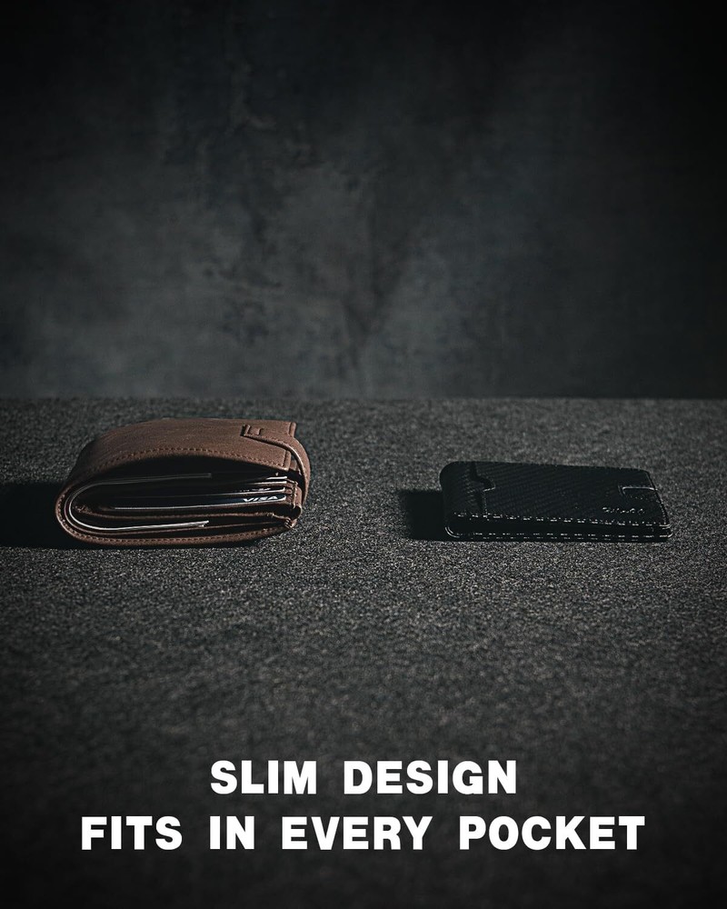 Premium Carbon Leather with Lifetime Guarantee - Crafted from vegan leather, our bifold wallet combines exceptional durability with comfort. Backed by a lifetime guarantee, it won’t wear out or peel. Invest in lasting quality with No Money Clip Design - Metal clips can damage cards and add bulk. We’ve replaced the clip with a cash compartment to keep the wallet slim and protect your cards Slim Wallet for Men - Measuring 4.3 x 3 x 0.5 inches, this bifold wallet holds up to 11 cards and 15-20 bills. Its ultrathin design fits perfectly in your pocket, making it ideal for everyday use RFID Blocking Function - Designed by a German designer and crafted from premium leather, this wallet is durable, wear-resistant, and scratch-resistant. It blocks the 13.56 MHz band to protect against data theft from RFID scanners Perfect Gifts for Him - This bifold wallet comes in a classy gift box, making it an ideal present for birthdays, anniversaries, Valentine's Day, Father's Day, Christmas, and other special occasions