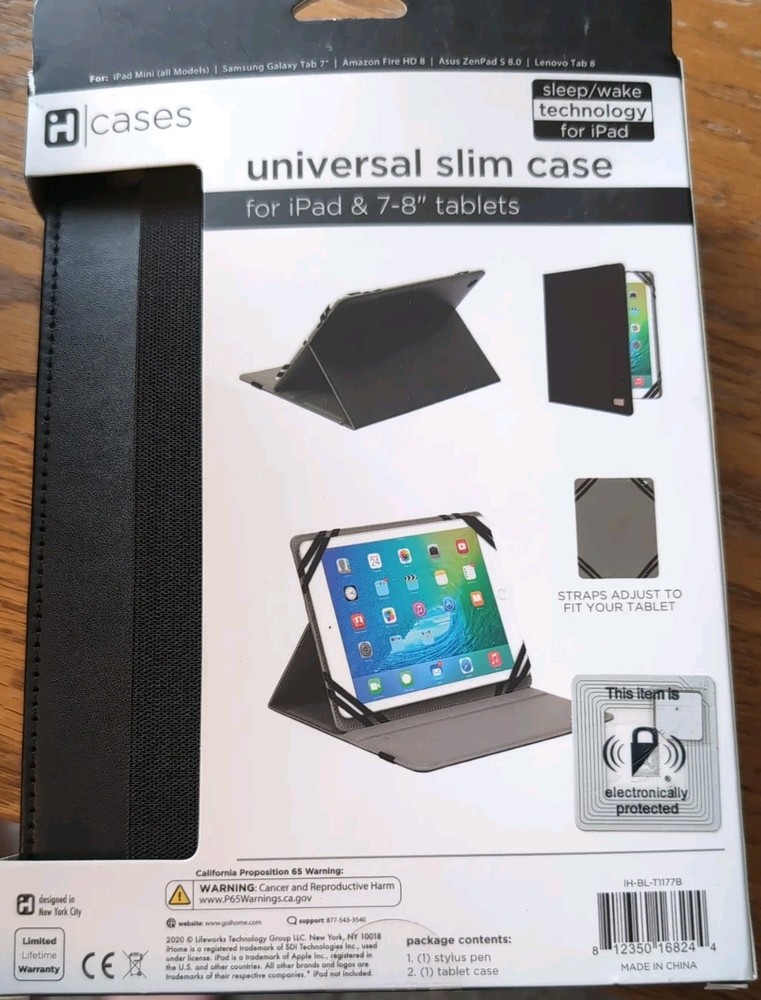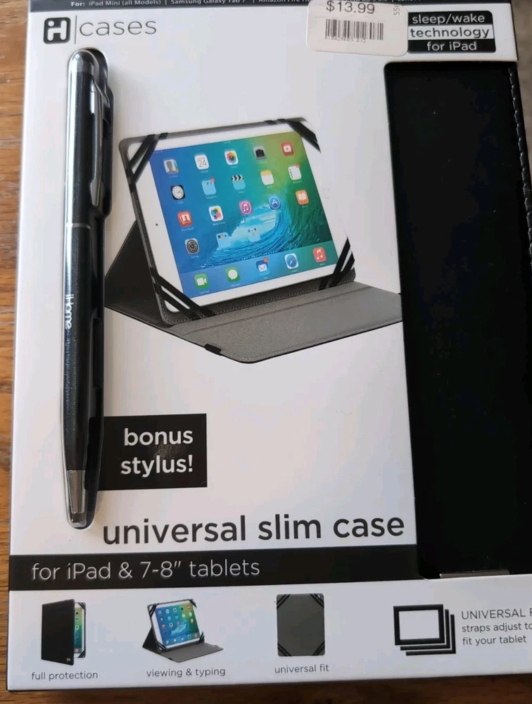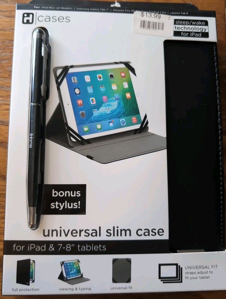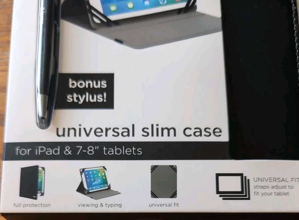 New Universal Slim Case for iPad and 7-8" tablets with a bonus stylus..Easy view universal adjusted strap fit full protection. In unopened packaging.